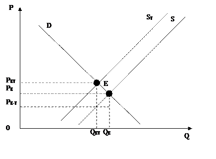Если в страну импортируется какой–то товар, то есть цена, по которой иностранная фирма готова его предложить. Государство же из соображений пополнения казны, защиты интересов национальных производителей, может вводить наценки к новым товарам – тарифы. На рисунке показан эффект введения тарифа на товар (он аналогичен ситуации с налогом от продаж)