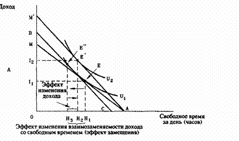 Возможно, однако, что работники не изменят число часов рабочего времени в среднем за день или даже будут работать меньше, когда заработная плата будет увеличиваться. Некоторые при этом сначала в ответ на повышение заработной платы решают работать дальше, но затем, когда заработная плата растет и дальше, удовлетворяются своим уже имеющимся доходом и начинают работать меньше. С тем чтобы полностью понять характер индивидуального предложения труда, необходимо рассмотреть эффект изменения дохода и эффект изменения взаимозаменяемости дохода и свободного времени (эффект замещения). Когда изменяется заработная плата, как эффект изменения дохода, так и эффект замещения влияют на выбор работника. Замещаемым или заменяющим благом является досуг. С подъемом заработной платы работа становится более привлекательной, т. е. отказ от каждого часа досуга принесет больше дохода. Альтернативная стоимость или неявная цена часа свободного времени будет выше, что заставляет человека замещать работой досуг. Эффект замещения при росте заработной платы, таким образом, благоприятен для работы (увеличения рабочих часов). Таким же образом, эффект замещения при снижении заработной платы побуждает человека заменить работу досугом и, таким образом, предложение рабочих часов работодателю снижается. Если бы эффект замещения был бы единственным результатом изменения в заработной плате, то кривые предложения труда всегда бы имели восходящий наклон. Есть, однако, другой эффект - эффект изменения дохода. Эффект изменения дохода при росте заработной платы возникает из-за того факта, что для любого данного количества рабочих часов денежный доход человека становится больше. Рост дохода, даже если нет никаких изменений в количестве рабочих часов, заставляют работника потреблять всех нормальных благ больше. Досуг для большинства людей - нормальное благо. Рост заработной платы, таким образом, приводит к эффекту изменения дохода, который заставляет человека отдавать больше часов досугу. Потребление большего количества свободных часов означает, что рабочий работает меньше. Эффект изменения дохода при росте цен на предлагаемый труд, таким образом, входит в противоречие с эффектом замещения. Рост заработной платы передвигает линию дохода от МA до М’А, как показано на графике А. Для человека, чьи кривые безразличия отражены на рисунке, равновесная продолжительность досуга снижается с H1 до Н2 . Количество рабочих часов вырастает с (24 – H1 ) до (24 - Н2 ).Это согласуется с восходящим наклоном кривой предложения труда, как показано на графике В. Расстояние Н3 Н1 есть уменьшение досуга в результате эффекта замещения при росте заработной платы. Эффект изменения дохода приводит к увеличению желаемого досуга на Н3 Н2 . Эффект замещения может быть отделен от эффекта изменения дохода при росте заработной платы. После учета подъема оплаты труда необходимо отнять определенное количество дополнительно заработанных денег, достаточное для того, чтобы сделать благосостояние работника таким же, как и до роста оплаты труда. На графике А ВМ рублей изымаются из дохода. Теперь мы имеем новую бюджетную линию «доход-досуг» - ВС. Вдоль этой линии доход меньше на ВМ рублей, но оплата труда находится на более высоком уровне. Работник был бы в равновесии в точке Е , где он имел бы Н3 часов 