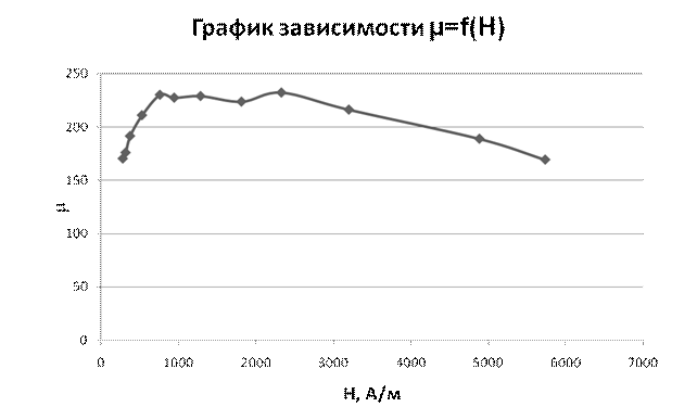 = µ2 =170,15 µ3 =175,81 µ4 =191,41 µ5 =210,98 µ6 =230,24 µ7 =227,5 µ8 =229,06 µ9 =223,79 µ10 =232,34 µ11 =216,25 µ12 =188,84 µ13 =169,16 5. Построить графики зависимости В=f(Н) и μ=φ(Н). Определить максимальное значение магнитной проницаемости ферромагнетика.