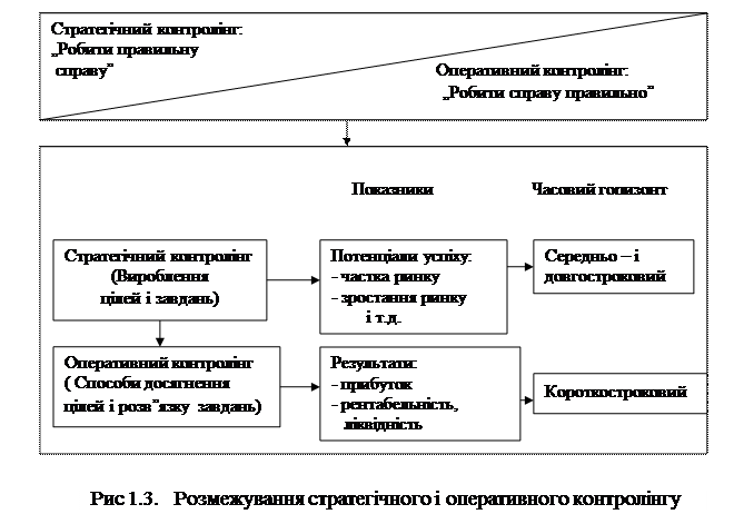 Функції і задачі контролінгу постійно доповнюються і змінюються по змісту. 2. Види контролінгу Сучасний менеджмент розділяє цілі підприємства на дві групи: оперативні (короткострокові) і стратегічні ( довгострокові, перспективні). А значить, контролінг як система включає два основних аспекти (підсистеми): стратегічний і оперативний. У літературних джерелах сутність кожного аспекту визначається досить лаконічно: Стратегічний контролінг - „робити правильну справу” Оперативний контролінг - „ робити справу правильно”. Розмежування стратегічного і оперативного контролінгу наведено у рис 1.3.