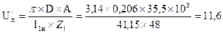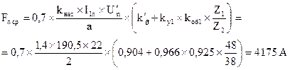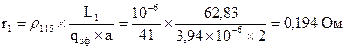 [по табл. П1.6, 1] при Ва =1,55 Тл, НА =630 А/м при ВJ =0,88 Тл, НJ =146 А/м где при 2р=6 где 5.6 Магнитное напряжение на пару полюсов: 5.7 Коэффициент насыщения магнитной цепи: 5.8 Намагничивающий ток: относительное значение: 6. Параметры рабочего напряжения 6.1 Активное сопротивление фазы обмотки статора: Для класса нагревостойкости изоляции F расчетная температура Для медных проводников Длина проводников фазы обмотки: Длина вылета лобовой части катушки: Относительное значение: 6.2 Активное сопротивление фазы алюминиевой обмотки ротора: