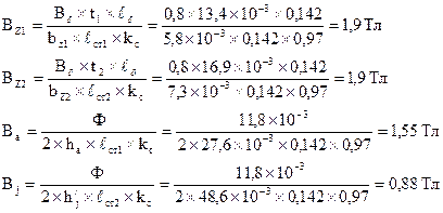 5. Расчет намагничивающего тока 5.1 Значение индукций: Расчетная высота ярма ротора при 2р=4, 5.2 Магнитное напряжение воздушного зазора: 5.3 Магнитные напряжение зубцовых зон: статора: ротора: [ по табл. П1.7,1] для стали 2013: при ВZ 1 =1,9 Тл, НZ 1 =2070 А/м; при ВZ 2 =1,9 Тл, НZ 2 =2070 А/м; hZ 1 =hп1 =25,9 мм; hZ 2 =hп2 -0,1∙в2 =24,7-0,1∙6,1=24,1 мм 5.4 Коэффициент насыщения зубцовой зоны: 5.5 Магнитные напряжения ярм статора и ротора: