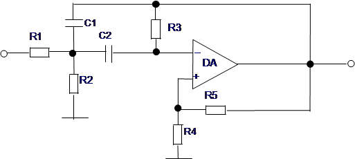 Добротность Q=3.14<2 - данный фильтр будет среднедобротным. Схема такого фильтра будет выглядеть следующим образом