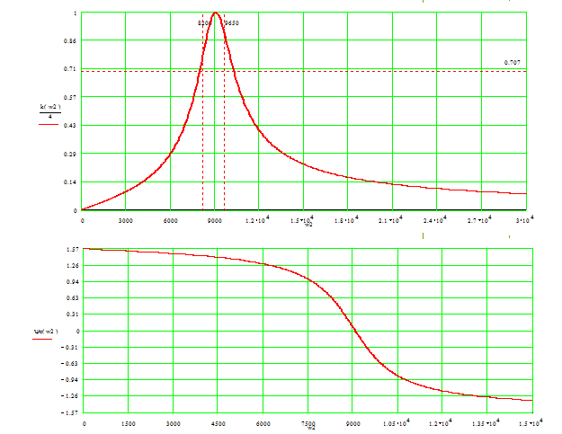 2. Для убеждения в правильности расчёта схемы, расчёты также проводились в программе “Mathcad”. В результате были получены зависимости АЧХ и ФЧХ от частоты, изображенные на рис. 5.