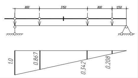 условие выполняется. 6.1.5 Определение наибольшего изгибающего моментаИзгибающие моменты можно определить по эпюре моментов, для чего построим ее (см рис 6.2) 6.1.6 Определение наибольшей поперечной силыДля определения максимальной поперечной силы загружаем линию влияния поперечной силы на опоре рис. 5.3.