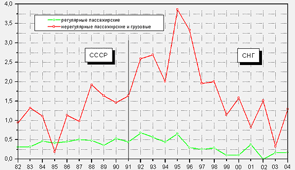 На пассажирские самолеты со сроком службы более десяти лет приходится свыше 75% численности парка, более двадцати – 15%. К 2007 г. предполагается списать до 40% воздушных судов, к 2008-10 гг. – до 80%. Таким образом, в ближайшие пять лет необходимо полное обновление парка гражданских судов. Приобретение авиакомпаниями отечественной техники снизилось до 8-10 единиц в год. В ущерб национальным интересам страны на внутренний рынок России активно вторгаются иностранные производители. Несмотря на это, минувший год стал для российской авиапромышленности самым успешным по количеству выпущенных самолетов, начиная с 1996 г. Аэропорты перегружены, техника стареет, авиадиспетчеры подчас не в силах выполнять свою работу. Все это создает серьезную угрозу безопасности полетов. Можно только догадываться, что испытывает наш пилот, который сегодня летит по российским правилам в Новосибирск, а через неделю должен следовать правилам европейского воздушного движения. Есть надежда, что новые авиационные правила РФ, приближенные к евростандарту, улучшат положение. 3. Сравнительный анализ безопасности полетов отечественных и зарубежных самолетов В течение многих десятилетий Запад придерживался мнения, что уровень безопасности полетов воздушных судов советского производства значительно хуже уровня безопасности их западных конкурентов. Одним из факторов, который поддерживал это мнение, была скупая информация по аварийности, представляемая авиационными администрациями СССР в международные организации. Она не позволяла сделать какие-либо объективные выводы об уровне совершенства гражданской авиационной техники отечественного производства, которая в настоящее время, в основном, эксплуатируется в странах СНГ. «Прозрачная» информация стала представляться, начиная с 1986 г. В Советском Союзе, так затем в странах СНГ уделяется огромное внимание обеспечению безопасности полетов. Авиационно-транспортная система стран СНГ, обеспечивающая эксплуатацию гражданской авиационной техники, которая была создана в СССР, а затем усовершенствовалась и функционирует в настоящее время, соответствует международным требованиям[8] . Но при этом следует отметить, что заметное ухудшение безопасности полетов в странах СНГ наблюдалось в начальный период перехода к рыночным отношениям в сфере авиационных перевозок 1992…1996 г.г. Этот период сопровождался беспрецедентными преобразованиями во всех сферах социальной и экономической деятельности, в том числе и инфраструктуре гражданской авиации. Характерной особенностью деятельности гражданской авиации в странах СНГ в это период являлось резкое сокращение объемов работ. Прежде всего, сократились перевозки пассажиров и грузов между населенными пунктами регионального значения, резко и значительно уменьшились объемы авиационных работ в народном хозяйстве. Объемы авиационных работ воздушными судами в рассматриваемый период непрерывно снижались во всех странах СНГ. В целом, они уменьшились в 4, 5 раза к 1999 г. и только, начиная с 1999-2000 г.г., отмечается рост объемов перевозок и работ. В странах СНГ в течение нескольких лет в гражданской авиации произошло перераспределение объемов работ между воздушными судами. Ранее в гражданской авиации СССР доля авиационных работ, выполняемых вертолетами и легкими самолетами в сфере мест