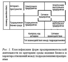 | Ведение предпринимательской деятельности в виртуальном пространстве И. Д. Котляров, Санкт-Петербургский филиал ГУ-ВШЭ В статье уточняются термины «электронное предприятие», «традиционное предприятие», «виртуальное предприятие» и «сетевое предприятие». Разработана двухкритериальная классификация современных форм ведения бизнеса. Предложена система классификации предприятий по использованию традиционных и электронных инструментов предпринимательской деятельности. Элементы интернет-экономики стали неотъемлемой частью современной бизнес-среды, и довольно трудно представить себе эффективно работающее предприятие, не использующее в той или иной форме интернет-технологии. Проблеме осмысления взаимоотношений между традиционной и интернет-экономикой посвящено немало исследований как в России, так и за рубежом (из русскоязычных источников хотелось бы обратить особое внимание на фундаментальную книгу Владимира Бугорского [1]). Тем не менее, ряд вопросов до сих пор остается без ответа [2; 3; 4], в частности, проблемы классификации и терминологии. Речь идет о том, что, с одной стороны, отсутствуют общепринятые критерии отнесения предприятий к субъектам традиционной или интернет-экономики [1; 4], а с другой – в профессиональной литературе такие термины, как «сетевое предприятие», «интернетпредприятие», «электронное предприятие» и «виртуальное предприятие» в ряде случаев используются как синонимы, хотя зачастую авторы говорят о различиях между этими типами предприятий [1; 3]. В данной статье мы предпримем попытку теоретического осмысления ведения предпринимательской деятельности в виртуальном пространстве. * Электронное, виртуальное и сетевое предприятие: анализ различий Под электронным предприятием мы предлагаем понимать компанию, которая взаимодействует с внешней средой и формирует свою внутреннюю © Котляров И. Д., 2010 среду исключительно посредством интернет-технологий (синоним – интернет-предприятие). Такое предприятие удовлетворяет следующим критериям: 1) продукт, распространяемый компанией, имеет информационную природу (книги, фильмы, аудиозаписи, компьютерные программы, графические продукты и т.д.) и закупается (или самостоятельно производится) и продается потребителям в цифровом виде по интернет-каналам (т.е. не имеет традиционного материального носителя, за исключением, возможно, центрального сервера компании, на котором хранятся все продаваемые ею продукты); 2) отсутствуют традиционные производственные активы; если компания самостоятельно занимается изготовлением своего продукта, то это происходит на компьютерах с использованием информационных технологий; 3) отсутствуют складские площади: продаваемые продукты размещаются на сервере и скачиваются покупателями непосредственно с него при подтверждении факта оплаты; 4) отсутствуют торговые площади: все взаимодействие с потребителем – размещение и подтверждение заказа, выписка счета, оплата и пересылка приобретенного товара – осуществляется через сайт компании; 5) отсутствует потребность в офисных площадях: сотрудники компании работают удаленно с использованием домашних компьютеров и ноутбуков, соединенных друг с другом через Интернет; 6) рекламные кампании проводятся только в сети Интернет; 7) закупка товаров у поставщиков производится при помощи 