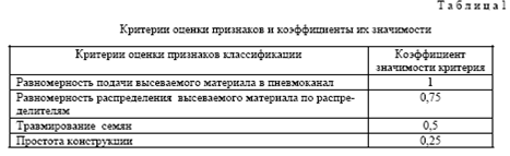 | Анализ и оценка дозирующих устройств современных посевных комплексов Нуруллин Э.Г., Исламов И.З., Салахов И.М. В статье приводится классификация дозирующих устройств современных посевных комплексов. Рассматривается морфологический анализ существующих и перспективных конструкций дозаторов. На основе анализа определены направления поиска перспективных конструкций дозирующих устройств посевных комплексов с централизованным дозированием и пневматической транспортировкой семян в сошники. В настоящее время, как в нашей стране, так и за рубежом в земледелии широко применяются посевные комплексы. Они относятся к типу посевных машин с централизованным дозированием и пневматической транспортировкой семян в сошники. Дозирующие устройства современных посевных комплексов отличаются большим разнообразием конструктивного исполнения. Целью данной работы является анализ и оценка конструкций дозаторов, используемых на современных посевных комплексах с централизованным дозированием и пневматической транспортировкой семян в сошники. При выполнении исследований использована методика структурноморфологического анализа конструкций машин и их рабочих органов [1]. В результате анализа литературы и изучения рабочего процесса дозаторов различных посевных комплексов систематизированы и выявлены основные признаки, на основе которых составлена их классификация. Дозирующие устройства можно классифицировать: 1.По конструктивно-технологической схеме: однопоточные, продольно расположенные, с клапаном; многопоточные, поперечно расположенные, без клапана; однопоточные, продольно расположенные, без клапана. 2. По способу изменения дозы: изменение частоты вращения и рабочей длины дозирующего валика; изменение частоты вращения и типа дозирующего валика; изменение рабочей длины и типа дозирующего валика. 3. По способу включения привода: механический; электромагнитный. 4. По типу рабочей поверхности: твердая; эластичная. Для оценки конструкций дозирующих устройств по признакам разработанной классификации на основе поисковых экспериментов определены и ранжированы основные критерии и коэффициенты их значимости (табл. 1).