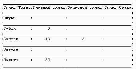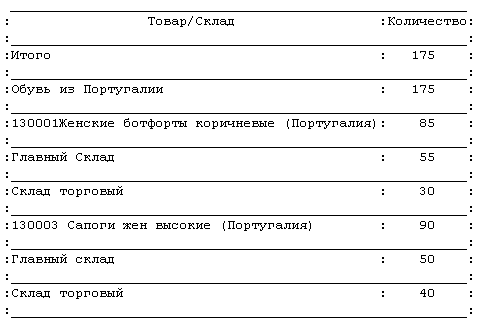 | Запросы . Терминология и обозначения - "Запрос" - объект метаданных типа "Запрос"; - Текст запроса - текстовое описание запроса к ИБ на специализированном языке запросов; - Выборка - набор данных, полученных в результате выполнения запроса; - Группировка данных - накопление различных значений одного и того же типа данных. - Отчёт - совокупность текста запроса, процедуры его выполнения и интерпретации выбранных данных. Для начала, прежде чем проектировать запрос, необходимо задаться вопросом: "Что же я хочу в результате получить?". Да, да, именно так все и начинается, с тривиальной "постановки задачи". Предположим, я хочу получить "Данные об оборотах и остатках товаров на складах за какой-то период времени" в виде вот такой таблицы: