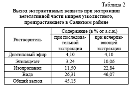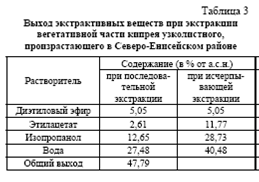Полученные данные показывают, что основными компонентами кипрея являются полисахариды, целлюлоза и лигнин. Химический состав кипрея Саянского и Северо-Енисейского районов практически одинаков. В вегетативной части растения, собранного в Емельяновском районе, можно отметить большее содержание биологически активных веществ по сравнению с двумя другими районами края. Содержание аскорбиновой кислоты составляет от 25, 12 до 49, 11 мг%, рутина – на уровне 16 мг%, что согласуется с данными [12]. С целью определения количества и состава основных классов экстрактивных веществ была проведена последовательная и исчерпывающая экстракция кипрея узколистного группой растворителей: диэтиловый эфир, этилацетат, изопропанол и вода. Полученные данные представлены в табл. 2-4.