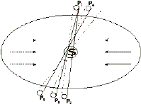Планета Р в период между галактическими зимами обращалась вокруг центрального тела S с углом наклонения около 900, постоянно проходя через одни и те же точки Р1 и Р2 в северном и южном небесных полушариях. С наступлением Галактической зимы небесное тело Р обращается вокруг тела S, будучи погруженной в ее разряженную и сплюснутую атмосферу, вращающуюся с телом S справа налево, как указано стрелками. При перемещении из северного полушария в южное, тело Р оказывается в потоке разряженного газа, который направлен по отношению к телу Р сбоку. Вследствие этого газовый поток, передав телу Р часть своего количества движения, вынуждает его свернуть с прежней траектории и тело Р проходит в южное полушарие не в точку Р2, как раньше, а в точку Р3, расположенную чуть левее точки Р2. Перемещаясь из южного полушария в северное, тело Р под влиянием газового потока, двигающегося относительно него слева направо, т. е. в противоположную сторону, чем на ближней от нас стороне центрального тела и его атмосферы, проходит по траектории из точки Р3 в точку Р4, расположенную чуть правее точки Р1. Затем, снова обращаясь вокруг тела S, тело Р попадает в точку Р5, еще больше смещенную от точки P2 влево и т.д. В результате плоскость орбиты тела Р будет постепенно разворачиваться, все более приближаясь к плоскости экватора тела S. С каждым витком вокруг центрального тела S угол наклонения плоскости орбиты небесного тела будет уменьшаться. Если же при этом угол наклонения был сначала больше 900 и, следовательно, направление обращения небесного тела Р было обратным, оно постепенно будет приближаться сначала к прямому направлению , а угол наклонения - к прямому углу. Затем угол наклонения еще больше изменится и будет меньше 900, а направление обращения из обратного преобразуется в прямое. Из рисунка 8 видно, что в зимнюю атмосферу центрально го тела S в его экваториальной области могут попасть только ближние тела (планеты и спутники), обращающиеся вокруг него. Но ведь изменение направления обращения распространяется на все небесные тела. Возникает вопрос: каким образом изменяется направление обращения дальних планет и спутников из обратного на прямое? Существует ли для этого соответствующий механизм? Да, существует. И его существование подсказывают сохранившиеся остатки некогда мощных колец у планет-гигантов. Во время галактических зим, особенно суровых, когда Солнечная система пересекает плоскость Галактики в районе спирального рукава, осевое вращение небесных тел начинает увеличиваться и к концу галактической зимы небесные тела вращаются намного быстрее, чем в ее начале. А это в конце концов приводит к тому, что верхние слои протяженной зимней атмосферы небесных тел в районе экваториальной плоскости приобретают первую космическую скорость, и из атмосферы начинают выделяться газовые кольца, получившие независимое существование от небесного тела и его атмосферы. Вслед за первым газовым кольцом, имеющим одинаковую линейную скорость с верхними слоями атмосферы в надэкваториальной области вскоре образуется второе газовое кольцо, за ним третье, четвертое и т. д. Эти газовые кольца не могут слиться в единое более мощное кольцо, поскольку этому препятствует избыточное гравитаци онное притяжение небесного тела в экваториальной плоскости, подобно тому, как вода, текуща