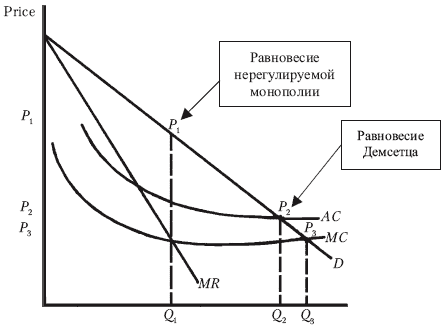Р. А. Мартусевич В статье доказывается возможность изъятия победителем конкурса за право быть естественным монополистом положительной монопольной ренты на рынке с линейным спросом. Для этого модифицируется модель конкурса за концессии с единственным критерием минимума цены, построенная для абсолютно неэластичного спроса. Определяется условие, когда верна гипотеза Г. Демсетца о равенстве цены победителя его ожидаемым удельным издержкам. В 1968 г. на основе предложенной Эдвином Чадвиком идеи «конкуренции за рынок» [4, 381–420] американский экономист Гарольд Демсетц в статье «Why Regulate Utilities?» («Зачем регулировать коммунальные предприятия?») развил теорию торгов за франшизу, т. е. за право быть естественным монополистом, и предложил ее в качестве решения проблемы регулирования тарифов естественных монополий [6, 55–65]. Демсетц утверждает, что недостаток традиционного подхода к регулированию естественных монополий заключается в неспособности провести различие между ex ante количеством участников торгов за право поставки и ex post условиями последней. Демсетц пришел к следующим важным выводам: — если предположить, что имеется много квалифицированных и не склонных к сговору участников торгов за контракт (франшизу), который будет за-ключен с тем из них, кто предложит наименьшую удельную цену поставки, то «цена победителя будет незначительно отличаться от удельных издержек производства» (и таким образом, по его мнению, будет полностью решена проблема регулирования тарифов на продукцию и услуги естественных монополий); — то есть даже если соображения эффективности могут требовать наличия ex post одного продавца в отрасли с естественной монополией, нерегулируемые рыночные цены могут быть свободными от элементов монополии (монопольной ренты). В более поздней своей статье, опубликованной в 1971 г., Демсетц уже прямо заявляет о равенстве цены и удельных издержек и о нулевой экономической прибыли, получаемой победителем торгов, возможно, предполагая постоянное наличие совершенной конкуренции на исследуемом рынке прав быть естественным монополистом [5, 356–363]. Там же он приводит следующий график (рис. 1).