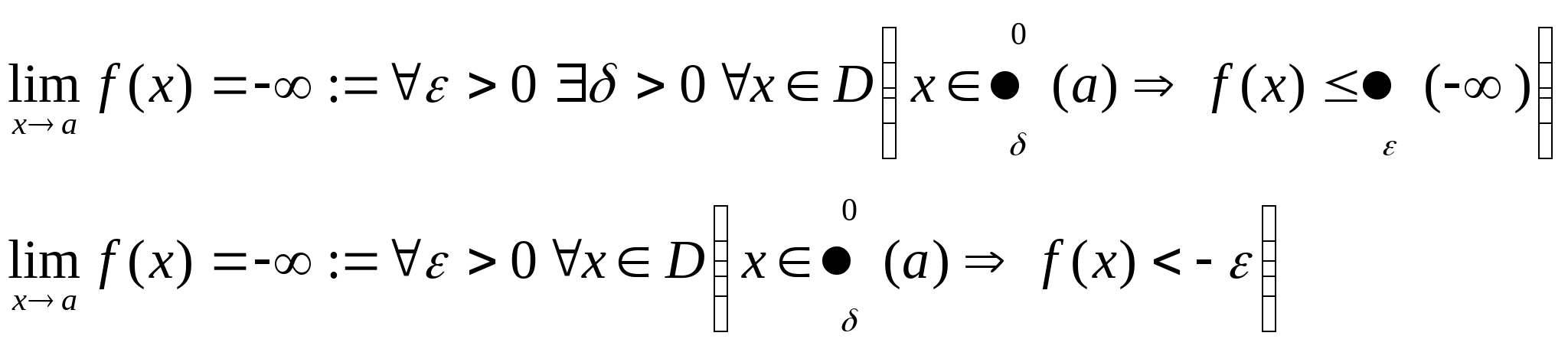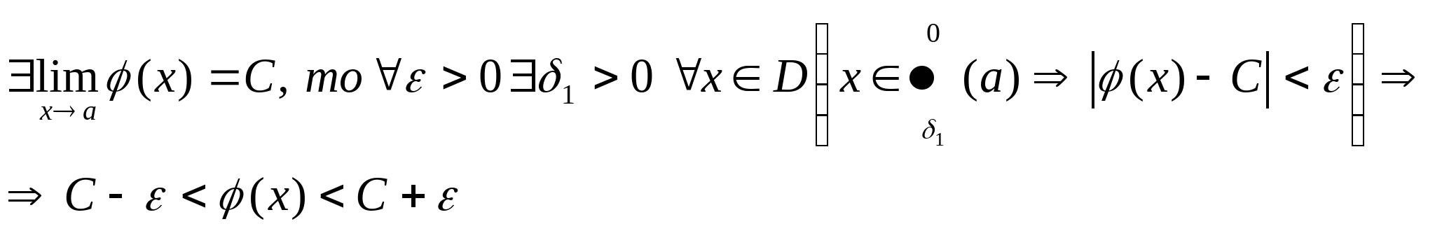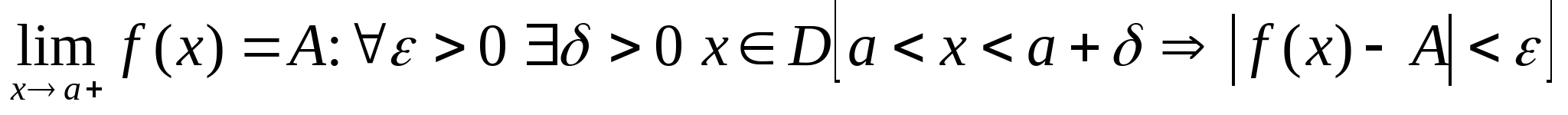 Односторонние пределы в конечной точке и их связь с пределом в этой точке. В определении предела окрестности точки а – симметричный интервал с центром в этой точке, т.е. требуется существование значений ф-ий как справа от точки а , так и слева от нее. Когда а – граничная точка D(f)- такая ситуация невозможна. В этом, случае вводится понятие одностороннего предела, в определении которого фигурирует левые и правые полуокрестности точки а