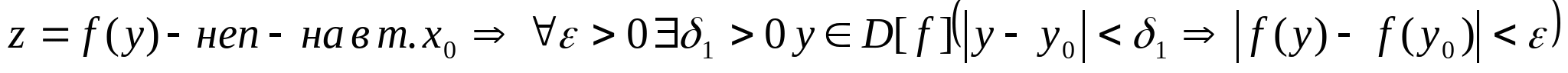 Непрерывность и арифметические операции Пусть Сумма этих ф-ий непрерывна в т. х0 ; 2. Произведение этих ф-ий непрерывно в т. х0 3. Отношение этих функций непрерывно в тех точках, в которых знаменатель отличен от нуля, т.е. если знаменатель 0. Доказательство: Непрерывность сложной ф-ии. Пусть: