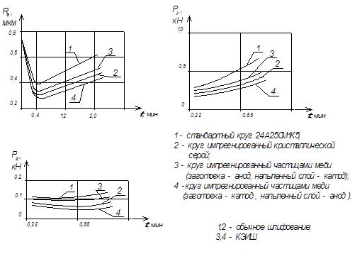 Сводная таблица технических норм времени по операциям 6.3 Оформление технологической документации Заключительным этапом разработки технологического процесса является оформление документации, заполнение маршрутных и операционных карт, карт эскизов по [19]. Маршрутная карта является основным и обязательным документом для любого технологического процесса и заполняется по ГОСТ 3.1118 - 82, на бланке формы 1. Операционная карта заполняется по ГОСТ 3. 1418 - 82, форма 3. В ней указывается содержание переходов, режимы резания, применяемые приспособления и инструмент. Карта эскизов заполняется на каждую отдельную операцию и прикладывается к соответствующей операционной карте. 7. СОВЕРШЕНСТВОВАНИЕ ОПЕРАЦИЙ НА БАЗЕ НАУЧНЫХ ИССЛЕДОВАНИЙ 7.1 Анализ ситуации Типовые операции шлифования детали “Шпиндель” содержат ряд недостатков, т.к. не учитывает некоторых особенностей обработки данной конкретной детали, а также последние достижения науки и практики машиностроения. С целью повышения эффективности шлифовальных операций ТП обработки “Шпинделя” проведем обзор различных способов достижения этого с решением следующих задач: - усовершенствование метода обработки; - усовершенствование режущего инструмента. На базе решения этих задач спроектируем усовершенствованную шлифовальную операцию. 7.2 Совершенствование метода обработки Одним из недостатков шлифовальной операции является низкая стойкость круга против засаливания, большой расход абразива на правку и высокая стоимость правящего инструмента, что в целом является причиной увеличения себестоимости операции шлифования. Износ абразивных кругов приводит к снижению качества шлифованной поверхности и точности обработки, в виду чего необходима периодическая правка. При обычном абразивном шлифовании затраты времени и расход абразива, связанные с правкой круга, доходят до 60 - 70 % всех затрат на операцию обработки, а в некоторых случаях до 90 - 95 %. Таким образом повышение стойкости абразивного круга – эффективный фактор повышения производительности труда и снижения себестоимости операции шлифования. Для устранения этого недостатка воспользуемся каким – либо физическим эффектом или явлением, которое предотвратило бы процесс засаливания круга. Нам представляется интересным явление наложения переменного магнитного поля на процесс шлифования. Проведенные испытания [27] показали, что при наложении переменного магнитного поля имеет место повышение стойкости абразивных кругов в 2-3 раза, что объясняется разупрочнением шлифуемого материала в переменном магнитном поле. Разупрочнение сталей при динамическом воздействии на них переменным магнитным полем обусловлено подвижностью дислокаций. При указанном способе шлифования имеет место комбинированное механическое, магнитное, электропластическое, тепловое и вибрационное воздействие на обрабатываемый материал. Сущность электроластического воздействия [28] состоит в повышении подвижности дислокаций под действием электронов проводимости и обусловлено индуцируемыми в заготовке вихревыми токами, плотность которых [29]