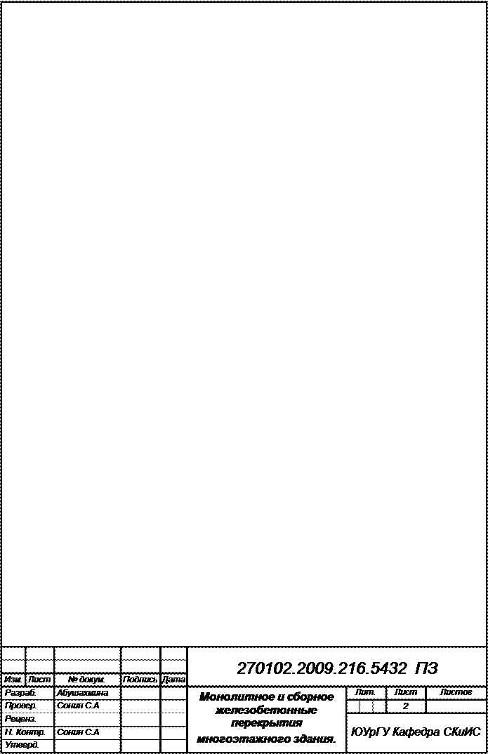 Государственное образовательное учреждение высшего профессионального образования «Южно-Уральский государственный университет» Факультет «Архитектурно-строительный» Кафедра «Строительные конструкции и инженерные сооружения» Монолитное и сборное железобетонные перекрытия многоэтажного здания ПОЯСНИТЕЛЬНАЯ ЗАПИСКА К КУРСОВОМУ ПРОЕКТУ по дисциплине «Железобетонные и каменные конструкции» ЮУрГУ-270102.2009.216.5432 ПЗ КП Нормоконтролер Руководитель С.А. Сонин С.А. Сонин «__»_______2009г. «__»_______2009г. Автор работы студент группы АС-457 Абушахмина М.Р. «__»_______2009г. Работа защищена с оценкой _______________ «__»_______2009г. Челябинск 2009г.