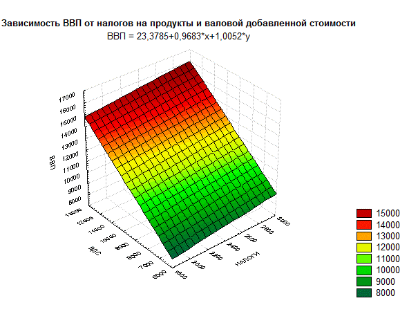 Для того, чтобы показать зависимость валового внутреннего продукта от валовой добавленной стоимости и от налогов на продукты будем использовать график поверхности «линейное сглаживание» (прил.И). Эта трёхмерная диаграмма аппроксимируется линейной функцией ВВП=23,3785+0,9683*x+ +1,0052*y. Такой вид графика полезен для наглядного представления результатов анализа. Посмотрев на данный график, можно не задумываясь сказать о линейной зависимости валового внутреннего продукта от налогов на продукты и валовой добавленной стоимости. В процессе выполнения курсовой работы мною на уровне пользователя была изучена программа STATISTICA, проведён графический анализ макроэкономических показателей системы национальных счетов и по построенным графикам проведён анализ. В курсовой работе приведено построение следующих статистических графиков: 1. Матрица графиков зависимости, точечные графики, столбиковые диаграммы (в пакете STATISTICA, главное меню: Графики / Matrix Plot) 2. Круговые диаграммы (в пакете STATISTICA, главное меню: Графики / Icon Plot) 3. Столбиковые диаграммы (в пакете STATISTICA, главное меню: Графики / Bar / Columm Plot) 4. Линейная диаграмма (в пакете STATISTICA, главное меню: Графики / Scatterplot) 5. Линейные диаграммы (в пакете STATISTICA, главное меню: Графики / Line Plot) 6. Картограмма (в пакете STATISTICA, главное меню: Графики / Stacked Plot) 7. Столбиковая диаграмма (в пакете STATISTICA, главное меню: Графики / 3D Sequential Graph) 8. Линейный график в трёхмерном пространстве (в пакете STATISTICA, главное меню: Графики / 3D Surface Plot) В итоге этой работы можно сделать вывод, что графический способ облегчает рассмотрение статистических данных, делает их наглядными, выразительными, обозримыми. На графике сразу видны пределы изменения показателя, сравнительная скорость изменения разных показателей, их колеблемость. Вместе с тем, можно сказать, что графики имеют определённые ограничения: прежде всего, график не может включить столько данных, сколько может войти в таблицу; кроме того, на графике показываются всегда округлённые данные – не точные, а приблизительные. Таким образом, график используется для изображения общей ситуации, а не деталей. Последний минус – трудоёмкость построения графиков. Но этот недостаток может быть преодолён использованием пакетов прикладных программ для компьютерной графики, например, STATISTICA. СПИСОК ИСПОЛЬЗОВАННЫХ ИСТОЧНИКОВ 1. Национальные счета Республики Беларусь : статистический сборник 2. Бондаренко, Н. Н. Статистика: показатели и методы анализа : справочное пособие / Н. Н. Бондаренко, Н. С. Бузынина, Л. И Василевская ; под ред. М. М. Новикова. – Минск : Современная школа, 2005. – 628 с. 3. Матегорина, Н. М. Статистика : учебник / Н. М Матегорина , Н. В. Толстик. – Ростов на Дону : Феникс, 2005. – 352 с. 4. Сиденко, А. В. Статистика: учебник / А. В. Сиденко, Г. Ю Попов, В. М. Матвеева. – Москва : Дело и сервис, 2000. – 464 с. 5. Харченко, Л. П. Статистика : курс лекций / В. Г. Долженкова, В. Г. Ионин; под ред. В. Г. Ионина. – Новосибирск : НГАЭиУ, М. : ИНФРА-М, 1998. 6. Иванов, В. Г. Основы математической статистики : учебное пособие для институтов физической культуры / В. Г. Иванов. – М. : Физкультура и спорт, 1990. – 176 с. 7. Шундалов, Б. М. Статистика. Общая теория : учебное пособие студентов экономических специальностей учреждений, обеспечивающих получение высшего с.-х. образования / Б. М. Шундалов. Минск : ИВЦ Минфина, 2006. – 288 с. 8. Боровиков, В. П. Программа STATISTICA 