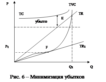 Валовой доход (TR) изображен прямой линией, т.к. каждая дополнительная единица продукции в условиях совершенной конкуренции добавляет одну и ту же величину (ее цену) к валовому доходу. Валовые издержки (TC) вначале возрастают с ростом производства за счет увеличения переменной части капитала. Затем падение кривой отражает действие закона убывающей отдачи факторов производства, в соответствии с которым, начиная с определенного момента, последовательное присоединение единиц переменного ресурса (труда, материалов и т.д.) к неизменному постоянному фактору дает уменьшающийся добавочный продукт. На первых порах темп роста валовых издержек становится все меньше и меньше, т.к. фирма использует свои постоянные ресурсы более эффективно. Потом, через определенное время, валовые издержки начинают увеличиваться возрастающими темпами вследствие неэффективности чрезмерного использования оборудования. Пересечения линий валовых издержек и валового дохода (в точках К1 и К2 ) являются критическими точками. В интервале до точки К1 производство убыточно, т. к. валовой доход не возмещает здесь валовые издержки. Максимальная прибыль будет производится при таком объеме производства, при котором будет достигнута наибольшая разница между валовым доходом и валовыми издержками. На графике прибыль максимизируется при объеме производства Q1 . Теперь рассмотрим ситуацию минимизации убытков (рис. 6). При низкой цене Р1 фирма не покрывает валовые издержки. Перед фирмой возникает дилемма: продолжать производство, минимизируя убытки в краткосрочном периоде, или закрыться? Если данная цена не позволяет получить прибыль, то валовые издержки превышают валовый доход (графически кривые нигде не пересекаются). Фирма может продолжать производство, минимизируя убытки, если в краткосрочном периоде валовый доход превышает переменные издержки. В этом случае фирма в состоянии возмещать стоимость израсходованных сырья и материалов и выплачивать заработную плату наемным рабочим. Таким образом, фирма не прекратит производство продукции в том случае, если она понесет убыток значительно меньший, чем величина ее постоянных издержек. А это возможно, если валовый доход (TR) фирмы превышает совокупные переменные издержки(TVC).