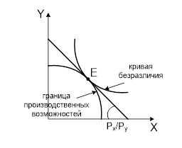Возникает вопрос, может ли сформироваться ситуация, когда одновременно достигается эффективность обмена и эффективность производства. Экономическая теория доказывает, что на рынке совершенной конкуренции это не только возможно, но и обязательно возникает. В этом случае эффективность производства можно представить через кривую производственных возможностей. При этом мы выяснили, что фирмы стремятся максимизировать объем производства при существенном ограничении, то есть оказываются на самой удаленной кривой производственных возможностей, выбирая определенную комбинацию производимых продуктов, учитывая при этом бюджетное ограничение на покупку факторов производства. Эффективность обмена может представляться с помощью кривой безразличия и субъекты могут оказаться на самой удаленной от начала координат кривой безразличия, выбирая определенную комбинацию продуктов, учитывая при этом бюджетное ограничение. Следует учитывать, что и фирмы и потребители ориентированы на те же самые товары, так как потребители стремятся максимально удовлетворить свои потребности, а фирмы производят те товары, которые необходимы потребителям. С этой точки зрения расходы потребителя на покупку товаров и услуг в рамках своего бюджетного ограничения будут обеспечивать доходы фирм от продажи соответственной продукции и соответствующего формирования бюджетного ограничения фирм. Это означает, что и для домохозяйств, и для фирм бюджетного ограничения по величине являются одним и тем же. С учетом этого можно утверждать, что кривая производственных возможностей и кривая безразличия будут касаться друг друга, то есть фирмы будут производить максимально возможный объем продуктов, а потребители будут потреблять весь объем произведенных продуктов, максимизируя свою полезность.