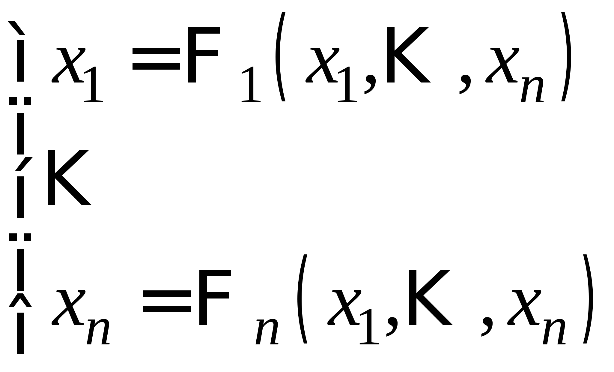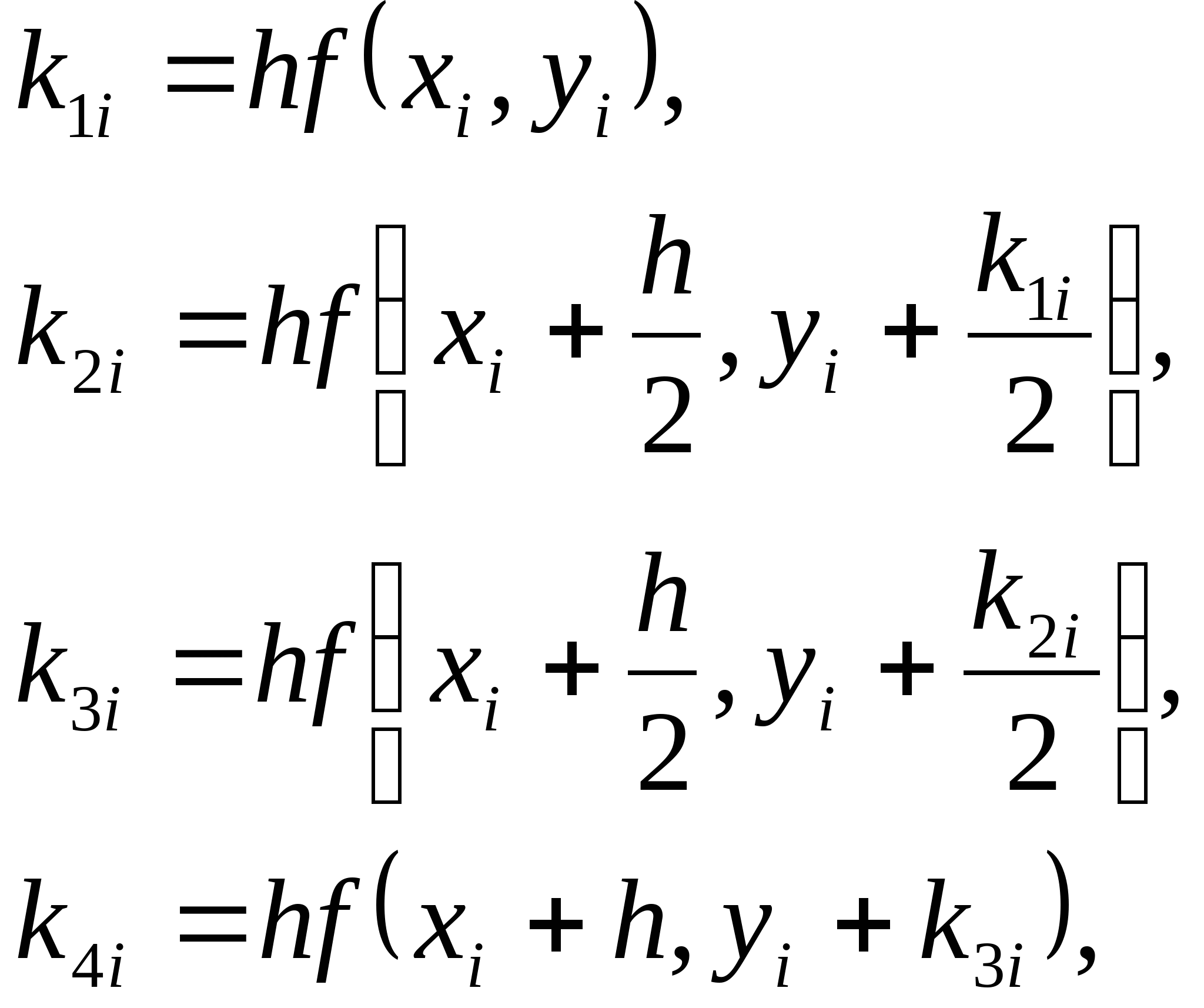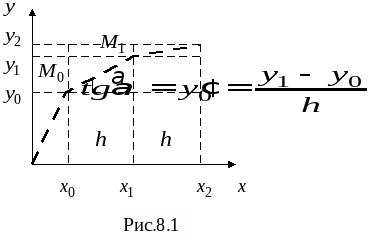 интерполяционная формула Лагранжа; первая интерполяционная формула Ньютона; вторая интерполяционная формула Ньютона; формула квадратичной интерполяции; формула линейной интерполяции. ПРИЛОЖЕНИЕ 8. СПИСОК ВОПРОСОВ ДЛЯ ПОВТОРЕНИЯ УЧЕБНОГО МАТЕРИАЛА 1. Источники и классификация погрешностей. 2. Основные понятия и определения теории погрешностей. 3. Значащая и верная цифра приближенной величины. Округление чисел. 4. Погрешность алгебраической суммы. 5. Погрешность произведения и частного. 6. Погрешность степени и корня. 7. Погрешность функции. 8. Обратная задача теории погрешностей. 9. Основные этапы решения нелинейных уравнений. 10. Метод половинного деления. 11. Метод простых итераций для решения нелинейных уравнений. 12. Метод Ньютона (метод касательных) для решения нелинейных уравнений. 13. Модифицированный метод Ньютона для решения нелинейных уравнений. 14. Метод простых итераций для решения систем нелинейных уравнений. 15. Метод Ньютона для решения систем нелинейных уравнений. 16. Модифицированный метод Ньютона для решения систем нелинейных уравнений. 17. Метод простых итераций для решения систем линейных алгебраических уравнений. 18. Метод Зейделя. 19. Метод релаксации. 20. Интерполяционная формула Лагранжа. 21. Первая интерполяционная формула Ньютона. 22. Вторая интерполяционная формула Ньютона. 23. Численное дифференцирование. 24. Квадратурная формула Ньютона-Котеса. 25. Формула трапеций. 26. Квадратурная формула Симпсона. 27. Приближенное вычисление несобственных интегралов. 28. Метод наименьших квадратов. 29. Метод Эйлера. 30. Метод Рунге-Кутта. 31. Метод Адамса. ГЛАВА 8. ПРИБЛИЖЕННОЕ Решение ОБЫКНОВЕННЫХ ДИФФЕРЕНЦИАЛЬНЫХ УРАВНЕНИЙ И СИСТЕМ. Дифференциальные уравнения являются основным математическим инструментом моделирования и анализа разнообразных явлений и процессов в науке и технике. Методы их решения подразделяются на два класса: аналитические методы, в которых решение получается в виде аналитических функций; численные (приближенные) методы, где искомые интегральные кривые получают в виде таблиц их числовых значений. Применение аналитических методов позволяет исследовать полученные решения методами математического анализа и сделать соответствующие выводы о свойствах моделируемого явления или процесса. К сожалению, с помощью таких методов можно решать достаточно ограниченный круг реальных задач. Численные методы позволяют получить с определенной точностью приближенное решение практически любой задачи. Решить дифференциальное уравнение численным методом означает, что для заданной последовательности аргументов Рассмотрим три наиболее распространенных при решении практических задач численных метода интегрирования: метод Эйлера, метод Рунге-Кутта и метод Адамса. §8.1. Метод Эйлера. Этот метод обладает малой точностью и применяется в основном для ориентировочных расчетов. Однако идеи, положенные в основу метода Эйлера, являются исходными для ряда других численных методов. Пусть дано дифференциальное уравнение с начальным условием (задача Коши) и выполняются условия существования и единственности решения. Теорема Пиккара (теорема о существовании и единственности решения задачи Коши). Если в уравнении (8.1) функция где Требуется найти решение Выбрав шаг И Звено ломаной Сделав преобразование, получим формулу Эйлера: Вы