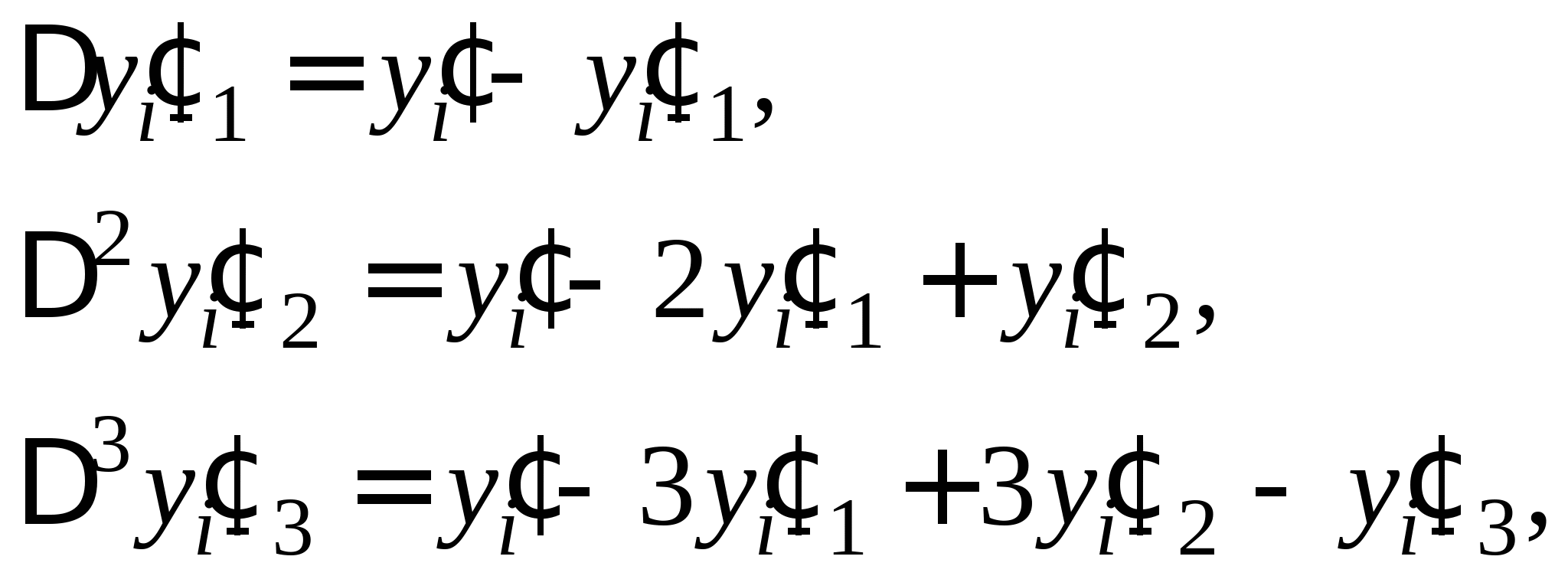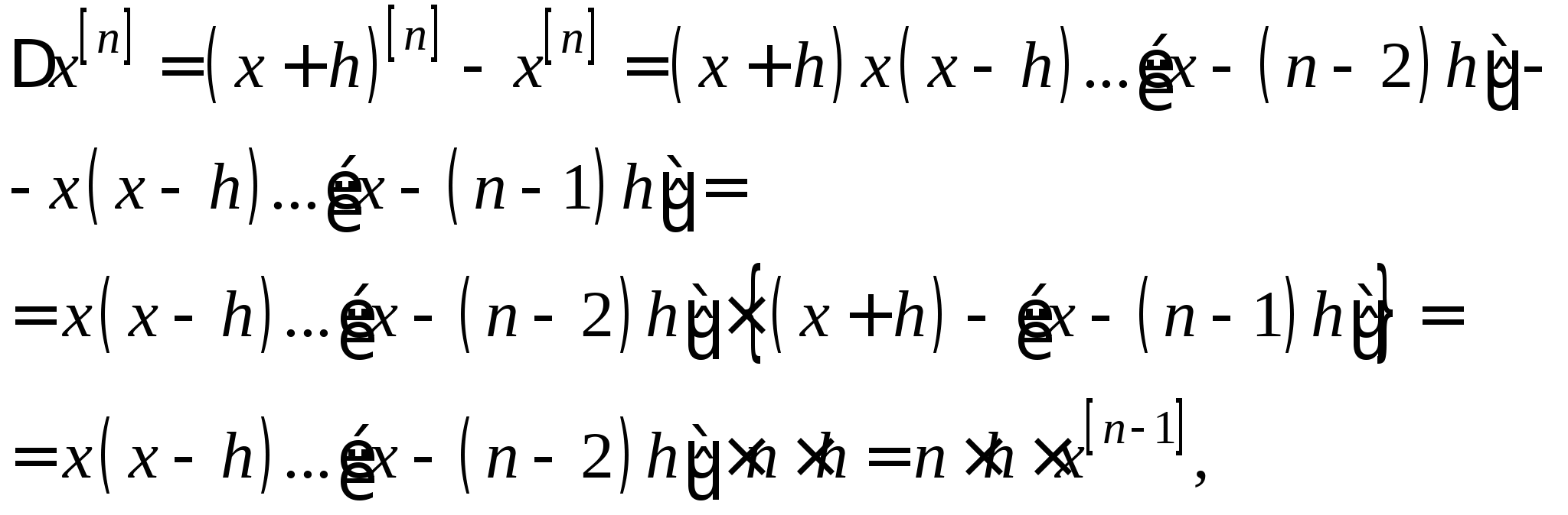 Из таблицы видно, что особенно эта ошибка распространяется, если используются конечные разности. ГЛАВА 5. Методы приближения ФУНКЦИЙ. §5.1. Постановка задачи аппроксимации и интерполяции функций. В вычислительной математике нередки случаи, когда одну функцию приходится заменять другой, более простой и удобной для дальнейшей работы. Такую задачу называют аппроксимацией функции. Поводом для аппроксимации функции может послужить, в частности, табличный способ ее задания. Предположим, что в результате некоторого эксперимента для конечного набора значений получен набор значений Повод для аппроксимации может возникнуть даже тогда, когда аналитическое выражение некоторой функции Другая ситуация, когда может потребоваться аппроксимация аналитически заданной функции – дифференцирование функции, вычисление определенных и неопределенных интегралов. Если аналитическое выражение функции достаточно сложное, то поставленная задача трудно выполнима, а иногда и невыполнима с помощью элементарных приемов. Например, интеграл Классический подход к численному решению подобных задач заключается в том, чтобы, опираясь на информацию о функции Для оценки «близости» функций выбирают тот или иной критерий согласия. Эти критерии основаны на использовании той или иной метрики, т.е. способа введения расстояния между функциями, принадлежащими тому или иному классу: Часто процедура аппроксимации связана с другим критерием согласия: Применяемый на его основе способ аппроксимации получил название метода наименьших квадратов. Для функций, заданных таблично, достаточно распространенным критерием согласия является критерий Чебышева, который определяет расстояние Если Задача интерполирования состоит в следующем. На отрезке Необходимо построить функцию Геометрически это означает, что нужно найти кривую В такой общей постановке задача может иметь бесконечное множество решений или совсем их не иметь. Сформулированная задача становится однозначной, если вместо произвольной функции Полученную интерполяционную функцию Различают интерполирование в узком смысле, т.е. когда §5.2. Конечные разности. Обобщенная степень. Пусть задана функция называется первой конечной разностью функции Например: Символ Легко проверить основные свойства оператора 1) 2) 3) Из формулы (5.3) имеем: Отсюда, рассматривая Из формулы (5.4): и т.д. Окончательно получим: В дальнейшем нам понадобится понятие обобщенной степени. Определение. Обобщенной где Полагают, что Вычислим конечные разности для обобщенной степени, полагая