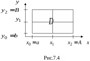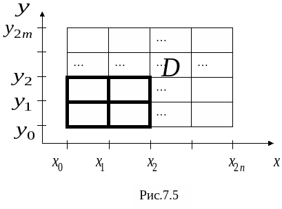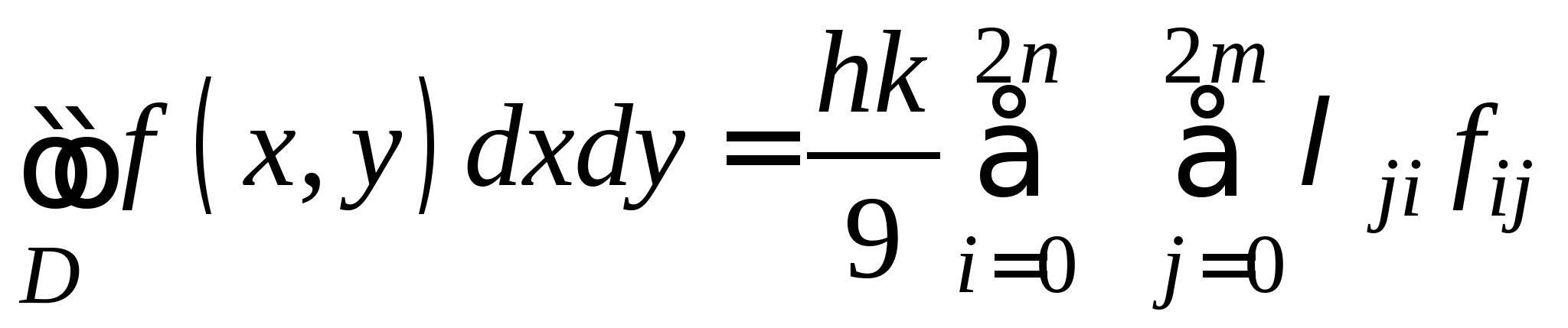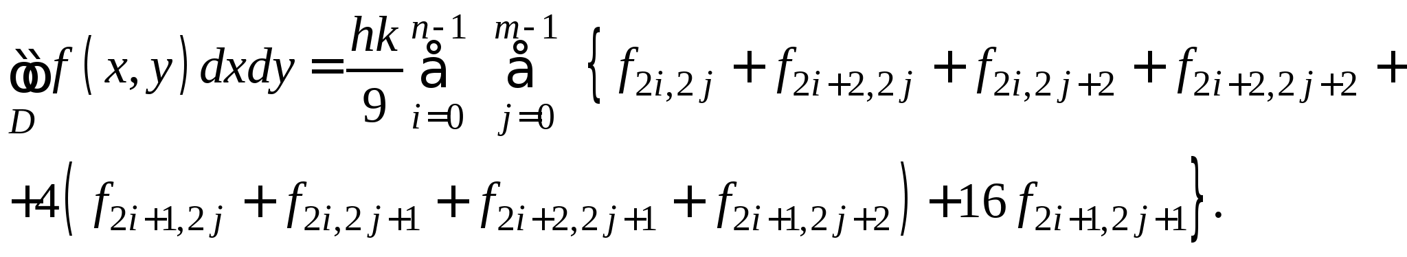 где Соотношение (7.20) – квадратурная формула Гаусса для вычисления произвольного интеграла. Остаточный член квадратурной формулы Гаусса (7.20) с §7.4. Приближенное вычисление несобственных интегралов. Определение 7.3. Интеграл (7.22) называется собственным, если промежуток интегрирования подынтегральная функция В противном случае, интеграл (7.22) называется несобственным. а). Рассмотрим приближенное вычисление несобственного интеграла (7.23) с бесконечным промежутком интегрирования, где функция Определение 7.4. И (7.24) и по определению полагают (7.25) Если предел (7.24) не существует, то интеграл (7.23) называется расходящимся. Поэтому, прежде чем приступить к вычислению несобственного интеграла, нужно предварительно убедиться, что этот интеграл сходится. Чтобы вычислить сходящийся несобственный интеграл (7.23) с заданной точностью (7.26) В силу сходимости интеграла число Собственный интеграл Из формул (7.26)-(7.28) имеем т.е. поставленная задача решена. б). Допустим теперь, что отрезок Так как промежуток интегрирования можно разбить на частичные промежутки с единственной точкой разрыва подынтегральной функции, то достаточно разобрать лишь случай, когда на Если и в случае существования этого предела интеграл называют сходящимся, в противном случае – расходящимся. Аналогично определяется сходимость несобственного интеграла, если точка разрыва Для приближенного вычисления с заданной точностью Затем по известным квадратурным формулам вычисляют определенные интегралы Если точка разрыва §7.5. Кубатурные формулы типа Симпсона. Рассмотрим один из методов приближенного вычисления двойного интеграла. Так как двойной интеграл вычисляется через повторный, то при приближенном вычислении двойного интеграла используется квадратурная формула Симпсона. 1) Вычислим Каждый отрезок г Получим девять точек с координатами Расписав двойной интеграл через повторный и применив два раза квадратурную формулу Симпсона, получим: Формула (7.30) называется кубатурной формулой Симпсона. 2) Пусть теперь область Введем обозначения