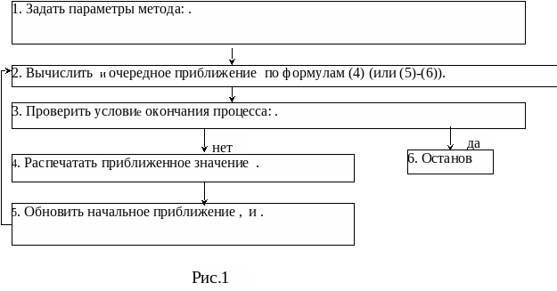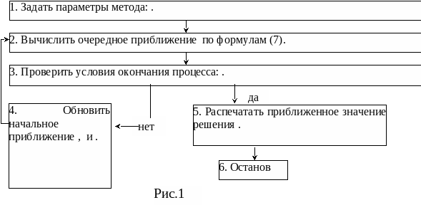 После несложных преобразований данные формулы примут вид: Заметим, что если частные производные Тогда СЛАУ (6) запишется так: Решением этой системы являются точки Для реализации на ЭВМ рабочие формулы можно переписать так: Итерационный процесс (7) можно начать, задав начальное приближение (2). Процесс (7) заканчивается при одновременном выполнении двух условий: 3. Для построения рабочих формул метода Ньютона в виде где необходимо: 1. Найти матрицу частных производных 2. Найти определитель этой матрицы: 3. Определить обратную матрицу: Проведя несложные преобразования получим рабочую формулу метода Ньютона (8) в виде: 3. Блок-схема МПИ и метода Ньютона для решения СНУ приведена на рисунке 1. Решение: в результате решения СНУ (1) при начальном приближении (2) методом простых итераций с точностью 4 Отчет о проделанной работе должен содержать: номер и название лабораторной работы; цель работы; содержание работы; задание на работу; теоретическую часть работы (вывод итерационных формул); листинг программы; таблицу результатов; выводы о проделанной работе. ПОРЯДОК ВЫПОЛНЕНИЯ РАБОТЫ 1. Определить аналитическое(ие) решение(я) исходной системы нелинейных уравнений. 2. Построить итерационные формулы, реализующие процесс поиска одного из решений системы нелинейных уравнений методом простых итераций и методом Ньютона. 3. Составить программу на любом языке программирования, реализующую построенные итерационные процессы, используя алгоритм методов, приведенный на рисунке 1. Печать результатов должна осуществляться на каждом шаге итераций в виде следующей таблицы: