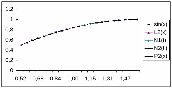 Для проверки правильности построения полиномов необходимо провести программно процесс табулирования четырех построенных полиномов и экспериментальной функции при Графики этих функций представлены на рисунке 1. Из графика видно, что искомые полиномы на отрезке практически совпадают с экспериментальной функцией и проходят через узловые точки. З Рис.1. 3. Содержание отчета. Отчет о проделанной работе должен содержать: номер и название лабораторной работы; цель работы; содержание работы; задание на работу; теоретическую часть работы (вывод интерполяционных и аппроксимационного полиномов); графики; листинг программы; таблицу результатов; выводы о проделанной работе. ПОРЯДОК ВЫПОЛНЕНИЯ РАБОТЫ 1. Составить программу на любом языке программирования, реализующую процесс построения указанных полиномов: 1.1. Сформировать таблицу значений экспериментальной функции 1.2. Вычислить значения коэффициентов интерполяционной формулы Лагранжа 1.3. Вычислить значения табличных разностей первого и второго порядков, необходимых для построения I и II интерполяционных формул Ньютона и записать непосредственно полиномы. 1.4. Для построения аппроксимационного полинома второго порядка вычислить необходимые суммы, сформировать СЛАУ 3-го порядка, решить ее любым известным методом и записать непосредственно полином. 1.5. Осуществить процесс табулирования четырех построенных полиномов и экспериментальной функции при