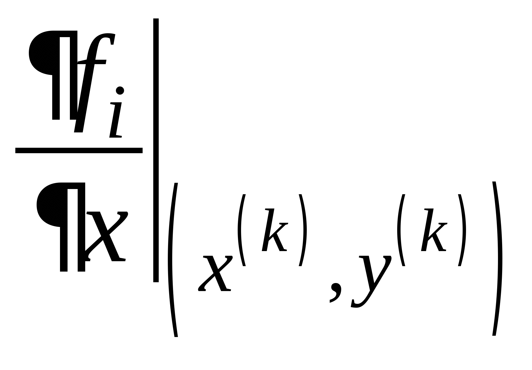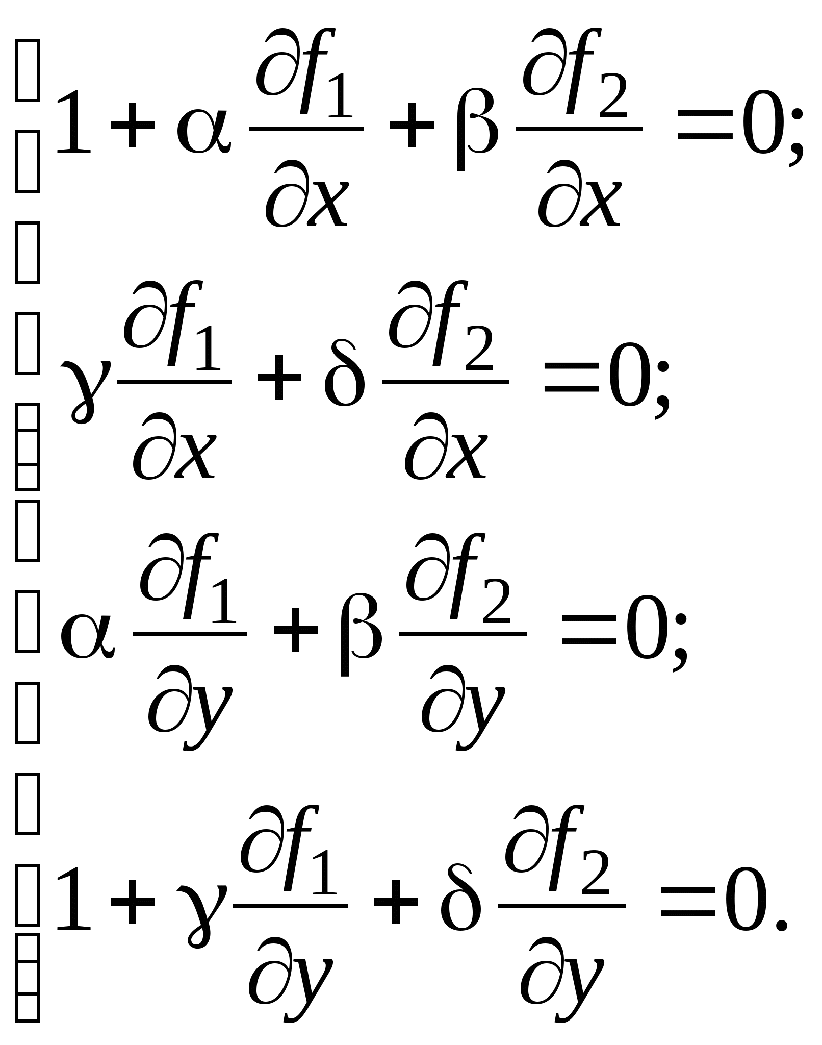 132 ЛАБОРАТОРНАЯ РАБОТА №3-4. ИТЕРАЦИОННЫЕ МЕТОДЫ РЕШЕНИЯ СИСТЕМ НЕЛИНЕЙНЫХ УРАВНЕНИЙ Цель работы: научиться решать системы нелинейных уравнений (СНУ) методом простых итераций (МПИ) и методом Ньютона с помощью ЭВМ. Содержание работы: 1. Изучить МПИ и метод Ньютона для решения систем нелинейных уравнений. 2. На конкретном примере усвоить порядок решения систем нелинейных уравнений МПИ и методом Ньютона с помощью ЭВМ. 3. Составить программу и с ее помощью решить систему уравнений с точностью 4. Изменить 5. Составить отчет о проделанной работе. ПРИМЕР ВЫПОЛНЕНИЯ РАБОТЫ Задание. 1. Аналитически решить СНУ вида: 2. Построить рабочие формулы МПИ и метода Ньютона для численного решения системы (1) при начальном приближении 3. Составить программу на любом языке программирования, реализующую построенный итерационный процесс. Решение. 1. Аналитическим решением СНУ (1) являются точки 2. Для построения рабочих формул МПИ для численного решения системы (1) необходимо вначале привести ее к виду: Для этого умножим первое уравнение системы (1) на неизвестную постоянную где где Неизвестные постоянные Запишем эти условия более подробно: Полагая равными нулю выражения под знаком модуля, получим систему линейных алгебраических уравнений (СЛАУ) 4 порядка с 4 неизвестными Для решения системы (6) необходимо вычислить частные производные Тогда СЛАУ (6) запишется так: Решением этой системы являются следующие значения: