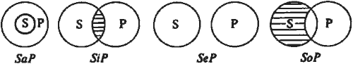 По схеме третьей фигуры построен силлогизм: Все бамбуки (М) цветут один раз в жизни (Р). Все бамбуки (М) – многолетние растения (S). Некоторые многолетние растения цветут один раз в жизни. По схеме четвертой фигуры построен силлогизм: Все рыбы (Р) плавают (М). Все плавающие (М) живут в воде (S). Некоторые живущие в воде – рыбы. Посылками и заключениями силлогизмов могут быть категорические суждения четырех видов: SaP, SiP, SeP и SoP. Модусами силлогизма называются разновидности фигур, отличающиеся характером посылок и заключения. Всего с точки зрения всевозможных сочетаний посылок и заключения в каждой фигуре насчитывается 64 модуса. В четырех фигурах 4 × 64 = 256 модусов. Силлогизмы, как и все дедуктивные умозаключения, делятся на правильные и неправильные . Задача логической теории силлогизма – систематизировать правильные силлогизмы, указать их отличительные черты. Из всех возможных модусов силлогизма только 24 модуса являются правильными, по шесть в каждой фигуре. Вот традиционно принятые названия правильных модусов первых двух фигур: 1-я фигура: Barbara, Celarent, Darii, Ferio, Barbari, Celaront ; 2-я фигура: Cesare, Camestres, Festino, Baroco, Cesaro, Camestros. В каждом из этих названий содержатся три гласных буквы. Они указывают, какие именно категорические высказывания используются в модусе в качестве его посылок и заключения. Так, название Celarent означает, что в этом модусе первой фигуры большей посылкой является общеотрицательное высказывание (SeP) , меньшей – общеутвердительное (SaP) и заключением – общеотрицательное высказывание (SeP). Из 24 правильных модусов силлогизма 5 являются ослабленными : заключениями в них являются частноутвердительные или частноотрицательные высказывания, хотя в случае других модусов эти же посылки дают общеутвердительные или общеотрицательные заключения (ср. модусы Cesare и Cesaro второй фигуры). Если отбросить ослабленные модусы, остается 19 правильных модусов силлогизма. Для оценки правильности силлогизма могут использоваться круги Эйлера, иллюстрирующие отношения между объемами имен. Возьмем, для примера, силлогизм: Все металлы (М) ковки (Р). Железо (S) – металл (М). Железо (S) ковко (Р). Отношения между тремя терминами этого силлогизма (модус Barbara) представляются тремя концентрическими кругами. Эта схема интерпретируется так: если все М (металлы) входят в объем Р (ковких тел), то с необходимостью S (железо) войдет в объем Р (ковких тел), что и утверждается в заключении "Железо ковко". Другой пример силлогизма: Все рыбы (Р) не имеют перьев (М). У всех птиц (S) есть перья (М). Ни одна птица (S) не является рыбой (Р). Отношения между терминами данного силлогизма (модус Cesare) представлены на рисунке. Он истолковывается так: если все S (птицы) входят в объем М (имеющие перья), а М не имеет ничего общего с Р (рыбы), то у S (птицы) нет ничего общего с Р (рыбы), что и утверждается в заключении. Пример неправильного силлогизма: Все тигры (М) – млекопитающие (Р). Все тигры (М) – хищники (S). Все хищники (S) – млекопитающие (Р). Отношения между терминами данного силлогизма могут быть представлены двояко, как это показано на рисунке. И в первом, и во втором случаях все М (тигры) входят в объем Р (млекопитающие) и все М входят также в объем S (хищники). Это соответствует информации, содержащейся в двух посылках силлогизма. Но отношение между объемами Р и S может быть двояким. Охватывая М , объем S может полностью вхо