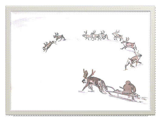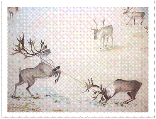 Единоборство. Работа Николаева Д.П. Поэтому его развилка верхних роговых выростов должна быть шире, чем развилка дикого. При удачной заброске петля соскальзывала с рогов домашнего оленя и затягивала рога дикого, препятствуя его отступлению для новой атаки. Как правило, олени, находясь, на мертвой связке пытались перетянуть, друг друга. Опытный, хорошо приученный к этой охоте домашний олень, чтобы удержать более сильного дикого оленя, сразу, почувствовав развязку, втыкал в землю рога или прибегал «к помощи» растущего дерева, втираясь, запутываясь петлей об ствол дерева. В это время охотник подкрадываясь, к стаде против ветра, пускал стрелы в важенок, спокойно наблюдавших за ходом поединка, целясь в живот и таким образом, ранил 3-4 самок, прежде чем стадо, распознав опасность, обращалось в бегство, увлекаемое молодыми самцами, оставляя раненых важенок и попавшего вожака. После этого охотник приканчивал ножом или ударом копья в позвоночник застрявшего в петле дикого самца. Таким образом, охотнику удавалось сразу добыть за один заход 4-5 диких оленей Способ подкрадывания с помощью оленя – манщика - «ондоотуланыы»