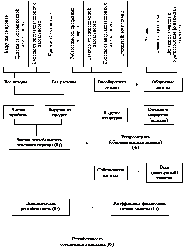 Рентабельность активов может повышаться при неизменной рентабельности продаж и росте объема реализации, опережающем увеличение стоимости активов, т.е. ускоренной оборачиваемости активов (ресурсоотдачей). И, наоборот, при неизменной ресурсоотдаче рентабельность активов может расти и за счет роста балансовой (до налогообложения) рентабельности. Большое значение для организации имеет то, за счет каких факторов растет или снижается рентабельность активов. Потому что у разных организаций неодинаковы повышения рентабельности продаж и увеличения объема реализации. Рентабельность продаж можно наращивать путем повышения цен или снижения затрат. Однако эти способы временны и недостаточно надежны в нынешних условиях. Наиболее последовательная политика организации, отвечающая целям укрепления ее финансового состояния, состоит в том, чтобы увеличивать производство и реализацию той продукции, необходимость которой определена путем улучшения рыночной конъюнктуры. При анализе экономической рентабельности, безусловно, нужно принимать во внимание роль отдельных ее элементов. Но зависимость целесообразно строить не через оборачиваемость элементов, а через оценку структуры капитала в увязке с динамикой его оборачиваемости и рентабельности. Из формулы расчета R4 хорошо видны возможные пути повышения экономической рентабельности – посредством увеличения прибыльности капитала. Показатель рентабельности собственного капитала (R5 ) позволяет установить зависимость между величиной инвестируемых собственных ресурсов и размером прибыли, полученной от их использования (рисунок 2.1). Следует отметить, что факторами, представленными на рисунке 2.1, и по уровню значений, и по тенденции изменения присуща отраслевая специфика, о которой не следует забывать, проводя анализ.