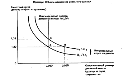 Рисунок 2. Сдвиги в спросе на деньги воздействуют на валютный курс. В точке А спрос на фунты стерлингов относительно долларов ( Lf / L ) точно соответствует относительному предложению фунтов к долларам М/М по цене равновесия 1,20 долл. за ф. ст. Если предложение фунтов сократится на 10%, то каждый фунт станет более редким и его стоимость возрастет. Это сокращение может быть достигнуто более жесткой денежной политикой Великобритании. Ограничительная политика будет уменьшать резервы банковской системы страны, заставляя банки предоставлять кредиты на более жестких условиях, уменьшать объем стерлинговых, банковских депозитов, которые составляют основу денежной массы Великобритании. Ужесточение условий кредита ухудшает и заемные возможности, сокращает общие расходы, уменьшая совокупный спрос на деньги, выпуск продукции, количество рабочих мест, цены. Через некоторое время сокращение выпуска товаров и рабочих мест приведет к падению цен на 40%. Сразу же и в более длительной перспективе курс фунта стерлингов должен повыситься. 10%-ное сокращение предложения денег в стране должно в конце концов привести к 10%-ному повышению курса фунта стерлингов (до 1,32 долл. в точке В). Точное совпадение процентного соотношения возможно только в довольно длительной перспективе, в более же короткие промежутки времени сокращение предложения денег может вызвать изменение значения коэффициента k . Такое же изменение от A до B может стать результатом 10%-ного повышения долларовой денежной массы. Если центральные банки в США и других странах, валюты которых привязаны к доллару, допустят 10%-ное повышение предложения долларов, то произойдет инфляция долларовых цен на 10%. В течение некоторого времени более высокие долларовые цены приведут к переключению международного спроса на товары и услуги, выраженные в фунтах стерлингов, которые остаются дешевле. В конце концов паритет покупательной способности восстанавливается путем 10%-ного повышения валютных курсов r . Если приведенное уравнение правильно, то одновременное увеличение в предложении денег на 10% (как в фунтах, так и в долларах) не должно оказывать воздействие на валютные курсы. 1.7. ВОЗДЕЙСТВИЕ РЕАЛЬНОГО ДОХОДА НА ВАЛЮТНЫЙ КУРС. Предположим, реальный доход Великобритании увеличился на 10% больше, чем это случилось бы в обычных условиях. Это могло произойти, например, после обнаружения новых нефтяных резервов на морском шельфе. Дополнительные продажи нефти стимулировали бы новый спрос на фунты стерлингов. Согласно количественной теории, 10%-ный рост национального дохода страны в результате новых продаж нефти ведет к 10%-ному повышению спроса для совершения сделок на фунт стерлингов. На графике спрос на фунты стерлингов повысился бы с 0,05 до 0,055 от общего объема долларовой массы в точке B . Но этот новый спрос не может быть удовлетворен, так как денежная масса Великобритании по-прежнему составляет только 0,050 от долларовой массы. В результате возникает ажиотаж вокруг фунтов. Все хотят либо занять их, либо продать товары, чтобы их получить. Стоимость фунта растет с 1,20 до 1,32 долл. в точке B . Повышение в соответствии с уравнением (при данном k ) валютного курса равно увеличению реального дохода. Однако национальный доход не является независимой составляющей, которая может сама по себе изменяться. То, что заставляет изм