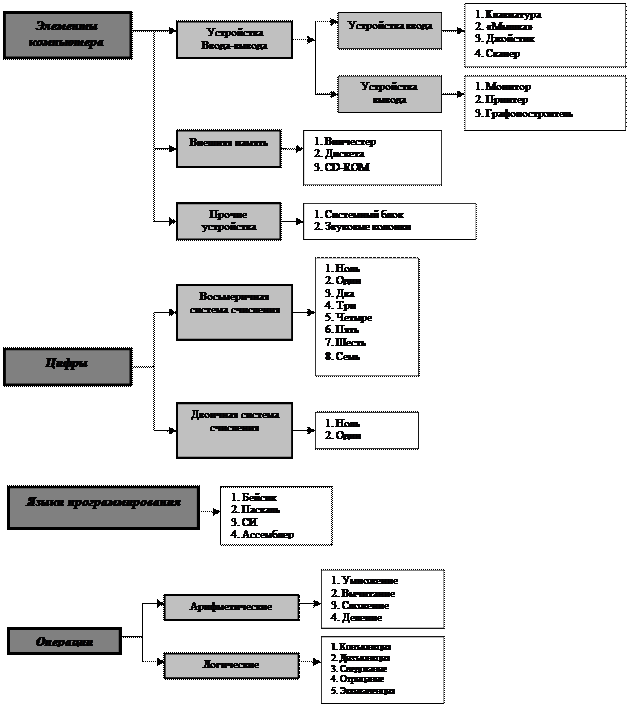 (4 по 3 балла) Задание 5 Все файлы и каталоги на дисках организованы в виде дерева. Если бы перечисленные ниже термины являлись именами файлов с соответствующим имени содержанием, то как бы организовали структуру этих фалов на диске. Нарисуйте «Дерево» файлов и каталогов: Один ноль манипулятор «Мышь» CD-ROM Бейсик ноль сложение Семь Монитор конъюнкция графопостроитель Сканер Один клавиатура пять СИ Звуковые колонки системный блок отрицание три Четыре вычитание Ассемблер шесть Умножение отрицание винчестер Паскаль Деление джойстик эквиваленция дизъюнкция Принтер следование два Дискета (13 Баллов) Задание 6 Составьте алгоритм решения следующей задачи. Как набрать из реки 7 литров воды, если имеются сосуды ёмкостью 3 и 8 литров? (5 баллов) Задание 7 Три свидетеля дали показания, что преступники скрылись с места преступления: a) на чёрном «Бьюике»; b) на синем «Форде»; c) Не на чёрном «Крайслере» Каждый из них в чём-то ошибался. На какой машине скрылись преступники? (10 баллов ) Задание 8 Квадрат, ромб, круг и треугольник вырезаны из белой, синей, красной и зелёной бумаги. Известно, что круг не белый и не зелёный, синяя фигура лежит между ромбом и красной фигурой, треугольник не синий и не зелёный, квадрат лежит между треугольником и белой фигурой. Какая фигура вырезана из зелёной бумаги? (10 баллов) Ответы Задание 1 1510 +1210 =2710 (5 баллов) Задание 2 Такого треугольника не существует, т.к. 1010 +1710 =27 (10 баллов.) Задание 3 Заполните пустые ячейки: