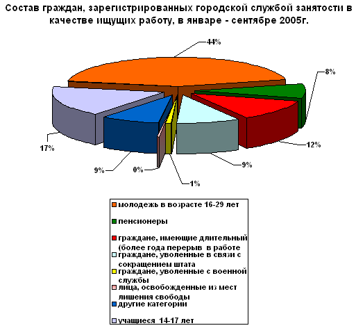 Рис.2.Сравнительная численность граждан, состоящих на учете в городской службе занятости населения на 01.10.2005г. и на 01.10.2004г. по районам Волгограда (чел.) 14 http://www.infovolgograd.ru/economy/economy.htm В отчетном периоде с помощью службы занятости нашел работу каждый второй из зарегистрированных в качестве ищущих работу или 19,6 тыс. чел, в т.ч. из числа молодежи (16-29 лет) - более 8,3 тыс. чел. Рассмотрим потребность предприятий и организаций Волгограда в рабочей силе в январе-сентябре 2005 г.(рис.3) 14