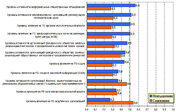 2.2. Прогноз изменения состояния гражданского общества в России по конкретным параметрам Изменение состояния гражданского общества в России оценивалось экспертами по четырем группам параметров: - изменение основных характеристик гражданского общества в России; - изменение активности и влияния основных субъекты, воздействующих на гражданское общество; - изменение целей основных субъектов, влияющих на гражданское общество; - изменение условий, факторов «внешней» среды. Далее будут представлены результаты анализа средних экспертных оценок по каждому параметру, которые предлагались экспертам в двух возможных вариантах: повышение и снижение значения (уровня и т.п.) показателя, каждый из которых оценивался по шкале от 0% до 100% вероятности изменения. 2.2.1. Изменение основных характеристик гражданского общества Судя по средним экспертным оценкам, в ближайшее время с высокой долей вероятности (более 50%) произойдут следующие изменения основных характеристик гражданского общества России (см. диаграмму 2.2-1): - повышение уровня социально-политической активности граждан; - снижение уровня финансирования организаций гражданского общества частным бизнесом; - снижение уровня финансирования организаций гражданского общества из государственных и муниципальных бюджетов всех уровней. В отношении остальных показателей доминирующего экспертного мнения по поводу повышения или уменьшения вероятности изменения состояния гражданского общества выявить не удалось. Диаграмма 2.2-1. Оцените, пожалуйста, вероятность появления или осуществления в ближайшие годы (3-5 лет) перечисленных ниже явлений или процессов изменения состояния гражданского общества в России (средние экспертные оценки по шкале от 0 до 1 вероятности)