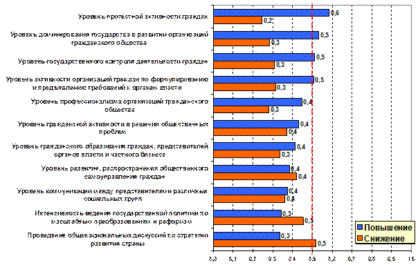 Диаграмма 3-4. Оцените, пожалуйста, вероятность появления или осуществления в ближайшие годы (3-5 лет) перечисленных ниже явлений или процессов изменения состояния гражданского общества в России (экспертные оценки по шкале от 0 до 1 вероятности)