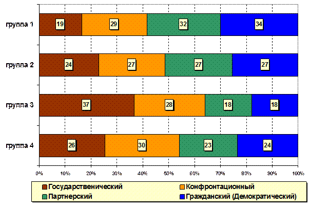 По данным Таблицы 2.3-6 все средние экспертные оценки весов целей акторов, определяющих состояние гражданского общества, находятся в диапазоне от 0,06 до 0,16, т.е. сравнительно слабо определяют состояние гражданского общества. По данным этой таблицы эксперты оценивают обеспечение государственного контроля деятельности граждан и руководящей роли государства в развитии организаций гражданского общества как те, которые наиболее сильно определяют состояние гражданского общества. Остальные цели оцениваются экспертами как существенно менее значимые для состояния гражданского общества. Экспертные оценки значимости целей акторов подтверждают вывод из анализа данных о том, по представлениям экспертов в настоящий период реализуется государственнический сценарий, поскольку наиболее значимыми для гражданского общества по оценкам экспертов являются цели, реализуемые в интересах органов власти и, в первую очередь, самими органами власти. Следовательно, эксперты оценили как малозначимые и при этом мало отличающимися по значимости друг от друга все факторы, определяющие состояние гражданского общества. Эксперты также оценили как наиболее значимые для состояния гражданского общества органы власти и цели, реализующие их интересы. Но различий по значимости акторов и их целей оказалось недостаточным для выделения по значимости государственнического сценария в многоуровневой процедуре оценивания по методике, разработанной на основе метода анализа иерархий Т. Саати. Наиболее вероятно, что это произошло в силу неопределённости и неустойчивости системных представлений экспертного сообщества о связях и взаимозависимостях факторов, акторов и их целей с тем, какие сценарии при тех или иных их связях и взаимозависимостях могут реализовываться. Кроме того, экспертные сессии по отбору значимых факторов, акторов и их целей, а также показателей состояния гражданского общества проводились по одноуровневым процедурам, которые не требовали проявлений экспертных знаний о связях и взаимозависимостях факторов, акторов и их целей со сценариями. Вероятно, по этой причине списки факторов, акторов и их целей оказались не вполне адекватными для многоуровневого оценивания экспертами значимости контрастных сценариев. В последующих исследованиях для обеспечения большей адекватности этих списков процедуре многоуровневого оценивания контрастных сценариев желательно проводить очные или заочные сессии обсуждения не только списков факторов, акторов и их целей, но и связей между элементами этих списков. 3. Типология экспертных представлений Так как при анализе средних экспертных оценок вероятности осуществления конкретных событий и контрастных сценариев какого-либо доминирующего представления о будущем гражданского общества России выявлено не было, было сделано предположение, что разные доминирующие сценарии могут присутствовать в представлениях разных групп экспертов. В данном разделе представлены результаты анализа экспертных оценок, призванного показать, какие группы экспертов ближе к тому или иному сценарию, и чем определяются их представления. Вместе с ресурсным анализом самих экспертных групп это должно привести к более точной оценке вероятности реализации разных прогнозных сценариев. По результатам анализа данных экспе