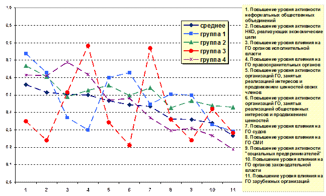 В оценках вероятности осуществления изменений по основным характеристикам развития ГО наибольшие различия зафиксированы для первой и третьей экспертной группы. Статистически значимые различия для этих экспертных групп зафиксированы по подавляющему большинству параметров, которые были подвергнуты экспертной оценке (см. диаграммы 3-2 – 3-5). При этом эксперты первой группы дают высокие средние оценки вероятности таким явлениям и процессам, которые следует признать позитивными для развития гражданского общества России (например, повышение уровня социально-политической активности граждан; улучшение состояния коммуникативной среды в обществе ) и низкие оценки тем событиям, которые для него неблагоприятны (например, повышение уровня влияния на ГО правоохранительных органов; повышение уровня доминирования государства в развитии организаций ГО ). Напротив, эксперты третьей группы склонны давать высокие средние оценки вероятности негативным для развития ГО явлениям (например, повышение уровня фрагментированности общества; повышение уровня государственного контроля над деятельностью граждан ) и низкие оценки позитивным процессам (например, увеличение численности членов в организациях ГО; повышение уровня активности организаций ГО ). Поэтому экспертов первой группы с определенной долей условности можно отнести к оптимистам, а второй группы – к пессимистам относительно перспектив развития гражданского общества в России. Таким образом, оптимистические и пессимистические настроения экспертов достаточно четко пролеживаются при анализе перспектив развития гражданского общества в России. Зафиксировать более конкретные доминирующие установки различных экспертных групп относительно будущего ГО в России не удалось в силу, прежде всего, отсутствия таких представлений не только среди экспертов в целом, но и среди более «гомогенных» экспертных групп. Диаграмма 3-2. Оцените, пожалуйста, вероятность появления или осуществления в ближайшие годы (3-5 лет) перечисленных ниже явлений или процессов изменения состояния гражданского общества в России (экспертные оценки по шкале от 0 до 1 вероятности)