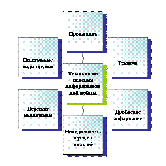 Рассмотрим подробнее особенности каждой из перечисленных технологий ведения информационной войны. 1. Пропаганда. Информационная пропаганда сводится к более менее систематическим попыткам манипуляции мнениями и убеждениями людей посредством различных символов: слов, лозунгов, монументов, музыки и т.д. От других способов распространения знаний и идей пропаганда отличается нацеленностью на манипуляцию сознанием и поведением людей. Пропаганда всегда имеет цель или набор целей. Для достижения этих целей пропаганда отбирает факты и представляет их таким образом, чтобы воздействие на сознание было наибольшим. Для достижения своих целей пропаганда может отбрасывать некоторые важные факты или искажать их, а также пытаться отвлечь внимание аудитории от других источников информации. Преднамеренное искажение и фильтрация информации отличает пропаганду от образования [26]. 2. Реклама. Успешная реклама - это убеждение. Успех в убеждении создает побудительные стимулы к действиям. Это относится не только к товарам, но и к восприятию идей. С помощью рекламы и убеждения можно обращаться и к покупателям, и к избирателям. Примером тому может послужить предвыборная кампания Б.Н.Ельцина в 1996 году. Информационно-психологические воздействия могут приводить к серьезным негативным последствиям в духовной и социально-политической жизни страны. Отдельные виды воздействий, обращенные к населению в целом или адресованные конкретным лицам, социальным слоям и группам, политическим партиям и движениям, способны серьезно нарушить нормальное функционирование и жизнедеятельность социальных институтов, государственных структур, общественных организаций, объединений граждан и отдельных лиц [26]. Эти воздействия квалифицируются как негативные, если вызывают психоэмоциональную и социально-психологическую напряженность, искажение нравственных критериев и норм, морально-политическую дезориентацию и, как следствие, неадекватное поведение отдельных лиц, групп и масс людей. Их отдаленные последствия проявляются в глубокой трансформации индивидуального, группового и массового сознания, в устойчивом изменении морально-политического и социально-психологического климата в обществе. 3. Дробление информации - еще один относительно новый способ осуществления информационной агрессии. Дробление как метод распространения информации особенно широко применялся сначала в США, но сегодня учёные говорят о том, что он проник и в Россию. Дробление и фрагментарную передачу информации называют «одним из характерных приемов культурного подавления, который, за редким исключением, не осознается преданными, но наивными профессионалами, сосредоточивающими внимание на локализированном подходе к проблемам и потому не способными воспринимать их как измерения одной общей проблемы в целом» [26]. Подобно тому, как реклама мешает сосредоточиться и лишает весомости прерываемую информацию, новая и эффективная техника обработки информации позволяет заполнить вещание большими объемами пустой и ненужной информации, которая еще больше осложняет для зрителя поиски смысла. Прослеживается очень четкая тенденция показывать разрозненные яркие события и не давать анализ происходящего. Другими словами, очевидно желание скрыть происходящее, заменив реальность взаимосвяз