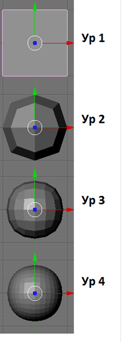 Рис 4. полигональная сетка В качестве ПО для проведения эксперемента мы выбрали 3D -редактор Blender. Он достаточно легок в освоении и содержит в себе все не обходимые функции: · Рендеринг изображения с возможность подключения и отключения трассировщика. · Oversampling(anti-aliasing или сглаживание) Мы замеряли время, необходимое на рендеринг 3-х различных сфер(стеклянной, зеркальной и матовой) на различных Уравных Multeris (каждый уровень повышает число полигонов в 4 раза). При повышении уровня время считали от 0.