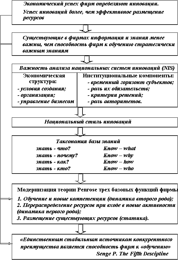 Содержание ГЛАВА 1. Национальная бизнес-система и система инноваций. 5 3. Знание как стратегический ресурс фирмы.. 9 3.1. Характеристики знания как орудия в конкуренции. 9 3.2. Связь знания – стратегия. 10 3.3. Схема стратегии знания. 13 3.4. Проблемы внедрения знания в действия фирм. 16 ГЛАВА 2. Анализ инновационной практики глобальных фирм. 19 4.1. Основные тенденции инновационной политики глобальных фирм. 19 4.2. Анализ тенденций затрат на НИОКР крупнейших глобальных фирм. 20 4.3. Анализ практики патентования крупнейших глобальных фирм. 31 4.4. Стратегические аспекты патентной активности. 37 В теории международной торговли доглобального периода стандартными являлись предположения, что производственные факторы (труд и капитал) остаются в национальных границах, в то время как знания свободно преодолевают последние. Продуктовая специализация национальных рынков, следовательно, отражает пропорции этих факторов, а не базы знаний. Однако, если мы попытаемся ревизовать эту схему анализа, то мы быстро усмотрим существенность национальных систем и стилей инноваций. Как отмечено выше экономический успех, особенно в долгосрочной перспективе отражает инновации в продуктах, процессах, рынках и организациях, в то время как размещение этих ресурсов становится менее важным. Следует подчеркнуть фундаментальное отличие в основе этого анализа – все последствия внедрения конкретных инноваций в процессе никогда нельзя полностью предвидеть. Если, мы добавим, что компетенции, искусства неравномерно распределены между индивидуальностями, организациями, регионами и нациями, то мы введем важность обучения и его национальные особенности в этот анализ. Специфические национальные особенности обучения могут быть особенно эффективными в частных отраслях, особенно в условиях радикальных технологических изменений. Фирмы или страны, где все внимание фокусируется на размещении существующих ресурсов наилучшим образом при производстве существующих продуктов по неизменным технологиям будут неизбежно стагнировать. следовательно, успех инноваций более важен, чем эффективное размещение /4, 1, 5, 6, 7/. Отсюда вытекает и следующее заключение – специфическая информация и знания, которыми экономические субъекты владеют в конкретные моменты времени менее важны, чем их способность к обучению /6/, особенно интерактивному. Критическими становятся национальные потенциалы обучения и инноваций, особенно если учесть фундаментальную неопределенность исходов при внедрении в инновации нового знания. Так становится важной национальная система инноваций (NSI) с учетом национальных экономической структуры и институтов. Обучение включает четыре институциональных компонента: – временной горизонт экономических субъектов; – роль обязательств субъектов; – сумма критериев рациональности их решений; – роль авторитетов. Институты понимаются как нормы, обычаи и правила, глубоко проникшие в сознание общества. Они играют главную роль в определении того, как люди относятся в друг другу, как они учатся и используют свои знания. Если институты определяют «как делаются вещи» и «какое место занимает в этом обучение», то при рассмотрении экономической структуры важно «что сделано» и, следовательно «что изучено». Очевидно существо NSI в том, что в разных странах различна степень связи между с