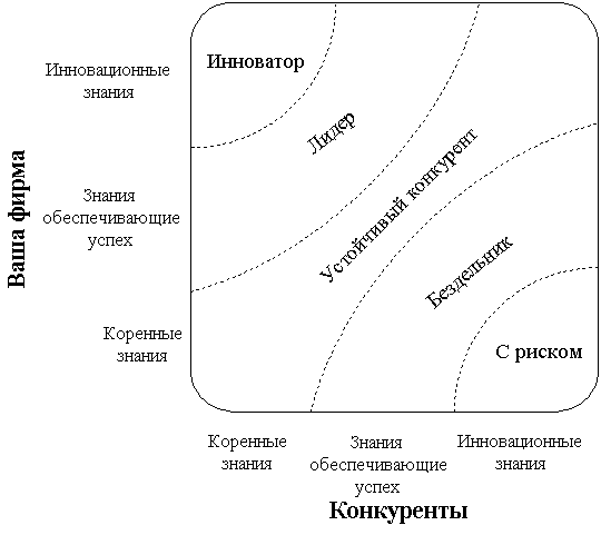 Рис.2. Современный системный подход к роли инноваций в конкуренции 3. Знание как стратегический ресурс фирмы 3.1. Характеристики знания как орудия в конкуренции Обладание доступом к важнейшему ресурсу – возможный путь создания конкурентного преимущества фирмы. Однако конкуренты могут имитировать его и разработать методы замены этого ресурса. Компании, которые обладают суперзнаниями способны координировать использование своих традиционных ресурсов или комбинировать их новыми и особыми путями, обеспечивая большую выгоду для потребителей, чем конкуренты /11, 13, 14/. Так имея интеллектуальные сверхресурсы, ограничения, можно понять как их использовать совместно со своими традиционными ресурсами. Следовательно, знания могут составлять наиболее важный ресурс, а способность получать, интегрировать, накапливать, сохранять и применять их есть наиболее важный способ создания конкурентного преимущества. Что в менеджменте знаний делают преимущество устойчивым? Знания, особенно полученные в результате специфического опыта фирмы, имеют тенденцию к уникальности и трудны для имитации. Однако, в отличии от многих традиционных ресурсов нелегко выйти на рынок со знаниями в «готовой для использования» форме. Для того, чтобы получить аналогичные знания конкуренты должны обладать аналогичным опытом и они ограничены в возможностях ускорить свое обучение даже при больших инвестициях. Конкурентное преимущество, основанное на знании, устойчиво, так как чем больше фирма знает, тем больше она может узнать /13/. Устойчивость в конкурентном преимуществе может приходить к фирме, знающей что-то, что обеспечивает возможность синергизма знаний, недоступную конкурентам. Новые знания интегрируются с существующими в организации для разработки уникального видения и создания новых более значимых знаний. Организации, следовательно, должны осуществлять мониторинг тех областей обучения и экспериментирования, где потенциальный конкурент может увеличит свои знания. Следовательно, существенность знания как основы конкурентного преимущества идет от знания, большего, чем у конкурентов, при наличии временных ограничений для конкурентов в достижении такого же уровня знаний. В отличии от физических ресурсов знания увеличивают свой экономический потенциал возврата при использовании, т.е. возникает самовоспроизводящийся цикл /15/. Если организация может идентифицировать те области деятельности, где ее знания делают ей преимущество в конкуренции, и если эти уникальные знания способны обеспечить прибыль, то может возникнуть мощное и существенное конкурентное преимущество фирмы в выделенных областях. Организации должны стремиться использовать свои возможности обучения для создания или укрепления своих конкурентных позиций, что обеспечит им преимущество в будущей конкурентной борьбе. Систематический мониторинг, категоризация и бенчмаркинг знаний не только обеспечит доступность знаний для организации, но и текущее использование карты знаний для оценки приоритетов и организации обучения. Такой рычаг позволит соединить усилия по обучению в «критическую массу» в частных стратегически важных областях знания. Когда преимущество в знаниях может быть устойчивым, создание защищенной конкурентной позиции дает долговременный эффект и действия в конк