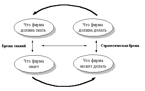 Рис. 3. Карта стратегических знаний фирмы Имея отраженную на карте конкурентную позицию фирмы по знаниям, она может приступить к gap -анализу. Разница в том, что фирма должна делать в конкуренции, и в том, что она действительно делает, представляет собой стратегическую брешь. Адресатом информации об этой бреши является штаб традиционного стратегического менеджмента. Как вытекает из схемы SWOT-анализа, сильные и слабые стороны фирмы дают возможность судить о том, что она может делать, благоприятные возможности и угрозы диктуют то, что она должна сделать. Стратегия, следовательно, представляет собой метод балансирования фирмой своих конкурентных «могу» и «должна» в целях разработки и защиты своих стратегических ниш. В тоже время выявление стратегических брешей определяет и потенциальную брешь знаний. Основываясь на карте стратегического знания и способностей, фирма может идентифицировать в каких категориях существующее знания фирмы находится в соответствии со стратегическими требованиями. Результатом такого анализа является выявление ряда потенциальных брешей знания. В некоторых случаях организация может знать даже больше, чем требуется для поддержки конкурентной позиции. Тем не менее стратегия знаний должна рассматривать любые возможные рассогласования. Чем больше число, изменения, размеры текущих и будущих брешей знаний и больше непостоянство базы знаний из-за динамики и неопределенности конкурентного окружения, тем более агрессивная стратегия знаний требуется. Фирма, которая не может реализовать требуемую стратегию, должна или подогнать свою стратегию под свои возможности, или овладеть способностями выполнять нужную стратегию. Имея усовершенствованную стратегическую эволюцию ресурсов и способностей на основе знаний, организация может определить какие знания следует разработать или получить. Чтобы учесть стратегический аспект менеджмента знаний, управление знаниями в фирме должно быть прямо ориентировано на закрытие стратегических брешей. Важный вывод состоит в том, что брешь знаний прямо вытекает из и согласуется со стратегической брешью (рис. 4). Это непрерывное согласование стратегии и знаний представляет собой критический момент фирменной стратегии знаний. Во многих фирмах эффективность управления знаниями зависит от степени разрыва между стратегическим планированием и практикой.