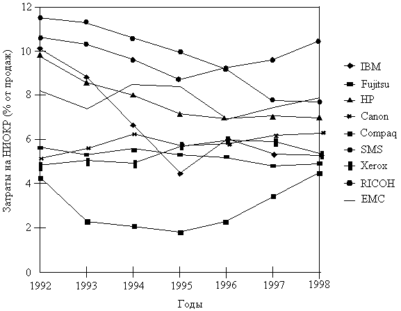 Результаты анализа по приведенным данным позволяют сделать следующие выводы: 1. Фирмы выделяют значительные объемы средств на проведение НИОКР (от 1% до 50% от объема продаж своей продукции). 2. Временные тренды (рис.6-13) показывают относительную устойчивость интенсивности НИОКР во времени большинства ведущих глобальных фирм. 3. Коэффициенты корреляции между объемами продаж и интенсивностью НИОКР в отдельных отраслях как правило имеют отрицательный знак, что свидетельствует о том, что интенсивность НИОКР выше у компаний, которые занимают худшую. конкурентную позицию, что косвенно свидетельствует о роли инноваций как орудия конкуренции. 4. В электронике и фармацевтике наблюдается значительная отрицательная корреляция интенсивности НИОКР и объемов продаж. В автомобилестроении, разработке программного обеспечения и в нефтяной промышленности наблюдается слабая корреляция, а в химической, аэрокосмической промышленностях и при разработке компьютерной техники она практически отсутствует. 5. Общий вывод: положение Портера о инновациях как главном инструменте глобальной конкуренции находит свое подтверждение в практике глобальных фирм в области НИОКР. 4.3. Анализ практики патентования крупнейших глобальных фирм Практика патентной деятельности отдельных компаний дает полезное представление о их стратегии в области НИОКР. Она отражает состояние технологического развития фирм и их конкурентов. Предыдущие исследования патентных трендов /23/ показали, что фирмы-резиденты США лидировали в инновациях во всех важных индустриальных сегментах за исключением химической промышленности. Изучение Портером и Бондом /28/ инновационного индекса за последние десять лет подтвердило это, хотя зазор между США и другими странами сокращается. Патентование – выход инновационной активности и средство защиты технологических преимуществ, важность которых при интернационализации экономической активности, как технологического конкурентного преимущества, увеличивается. Как любой индикатор итоги патентования имеют свои “ловушки”. Главные достоинства и недостатки использования патентования как индикатора технологического развития включают: Однако: В таблице 4.4 приведены данные ведущих компаний восьми наиболее представительных секторов промышленности по затратам на НИОКР, числу полученных патентов и отношению затрат на НИОКР на число патентов (патентная эффективность НИОКР) в 1998 г. Таблица 4.4 Основные характеристики патентной активности фирм в 1998 г.