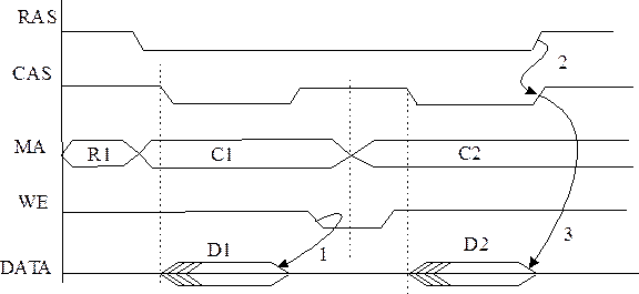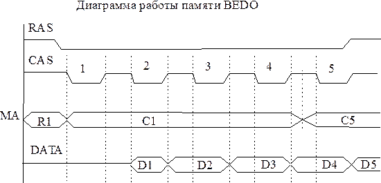 Рис 2.1.2.2 Диаграмма работы памяти EDO с использованием режима WE Для обеспечения стандартного режима, при смене адреса столбцов временно устанавливается сигнал WE, который переводит выход Data в Z-состояние (стрелка-1 ). После снятия сигнала WE выход переходит опять в нормальное состояние, после считывания всей страницы сигналы CAS и RAS снимаются и выходы переходят в Z-состояние (стрелки 2 и 3 ). Однако даже для EDO RAM существует предел частоты, на которой она может работать. Несмотря ни на какие ухищрения, модули SIMM не могут работать на частоте локальной шины PCI, превышающей 66 МГц. 2.1.3 BEDOДвукратное увеличение производительности было достигнуто в BEDO DRAM (Burst EDO). Добавив в микросхему генератор номера столбца, конструкторы ликвидировали задержку CAS Delay, сократив время цикла до 15 нс. После обращения к произвольной ячейке микросхема BEDO автоматически, без указаний со стороны контроллера, увеличивает номер столбца на единицу, не требуя его явной передачи. По причине ограниченной разрядности адресного счетчика (конструкторы отвели под него всего лишь два бита) максимальная длина пакета не могла превышать четырех ячеек (22=4).