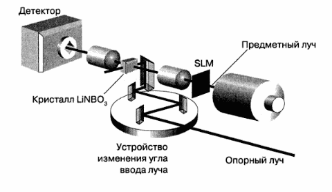Рис.5.2.1Голографическая установка Необычайные возможности топографической памяти заинтересовали ученых многих университетов и промышленных исследовательских лабораторий. Этот интерес уже довольно давно вылился в две научно-исследовательские программы. Одна из них - программа PRISM (Photorefractive Information Storage Material), целью которой является поиск подходящих светочувствительных материалов для хранения голограмм и исследование их запоминающих свойств. Вторая научно-исследовательская программа - HDSS (Holographic Data Storage System). Так же, как и PRISM, она предусматривает ряд фундаментальных исследований, и ее участниками являются те же компании. В то время как целью PRISM является поиск подходящих сред для хранения голограмм, HDSS ориентирована на разработку аппаратных средств, необходимых для практической реализации голографических запоминающих систем. Функционирование системы голографической памяти происходит следующим образом. На начальном этапе в этом устройстве происходит разделение луча сине-зеленого аргонового лазера на две составляющие - опорный и предметный лучи (последний является носителем самих данных). Предметный луч подвергается расфокусировке, чтобы он мог полностью освещать пространственный световой модулятор (SLM - Spatial Light Modulator), который представляет собой просто жидкокристаллическую (LCD) панель, на которой страница данных отображается в виде матрицы, состоящей из светлых и темных пикселей (двоичные данные). Оба луча направляются внутрь светочувствительного кристалла, где и происходит их взаимодействие. В результате этого взаимодействия образуется интерференционная картина, которая и является основой голограммы и запоминается в виде набора вариаций показателя преломления или коэффициента отражения внутри этого кристалла. При чтении данных кристалл освещается опорным лучом, который, взаимодействуя с хранимой в кристалле интерференционной картиной, воспроизводит записанную страницу в виде образа "шахматной доски" из светлых и темных пикселей (голограмма преобразует опорную волну в копию предметной). Затем этот образ направляется в матричный детектор, основой для которого служит прибор с зарядовой связью (CCD - Charge-Coupled Device или ПЗС), захватывающее всю страницу данных. При чтении данных опорный луч должен падать на кристалл под тем же самым углом, при котором производилась запись этих данных, и допускается изменение этого угла не более чем на градус. Это позволяет получить высокую плотность данных: изменяя угол опорного луча или его частоту, можно записать дополнительные страницы данных в том же самом кристалле. Однако дополнительные голограммы изменяют свойства материала (а таких изменений может быть только фиксированное количество), в результате образы голограмм становятся тусклыми, что может привести к искажению данных при чтении. Этим и объясняется ограничение объема реальной памяти, которой обладает материал. Динамическая область среды определяется количеством страниц, которые она может реально вмещать, поэтому участники PRISM и занимаются исследованием ограничений на светочувствительность материалов. Используемая в трехмерной голографии процедура заключения нескольких страниц с данными в один и тот же объем называется мультиплексированием. Традиционно используются следующие методы мультиплексирования: по 