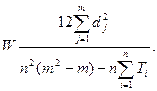 Если среди рангов, данных одним экспертом, есть равные, то коэффициент конкордации рассчитывается (формула 6.21):