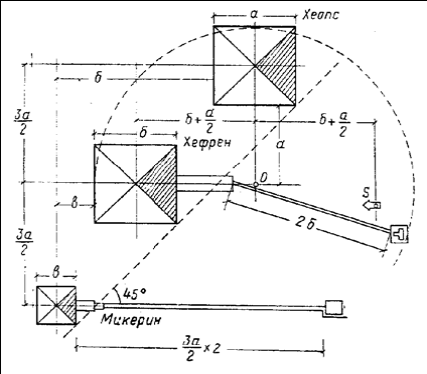 рис. 1. Пропорции пирамид в Гизе. Пропорции пирамид в Гизе близки между собой. Разрезы всех пирамид дают приблизительно одинаковое отношение высоты к стороне основания и сходный угол наклона 2 боковых сторон, равный у пирамиды Хеопса 51°20′, у пирамиды Хефрена 50°20′ и у пирамиды Микерина 51°. Высота и сторона основания пирамиды Хеопса — 146.59 и 230.35 м, а по другим данным — 148.2 и 232.8 м, Хефрена — 143.5 и 215.25 м; Микерина — 66.4 и 108.04 м. В пирамиде Хефрена отношение высоты к стороне основания составляет 2 : 3, причем эта пропорция выдержана математически правильно:
