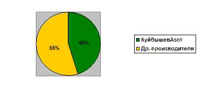 1.2. Оценка деятельности организации ЗАО «КуйбышевАзот»Основные сведенияАО "Куйбышевазот" - современное химическое предприятие, занимает лидирующие позиции в производстве капролактама в России и входит в десятку крупнейших российских производителей азотных удобрений. Специализация предприятия - производство и реализация продуктов органической (капролактам) и неорганической химии (аммиак, азотные удобрения и технологические газы), а так же продуктов химии полимеров (полиамид-6, высокопрочные технические нити и кордная ткань). "Куйбышевазот" сегодня: o Лидирует в производстве капролактама на территории СНГ o По оценке Института управления и экономики рынка РФ имеет первую (наивысшую) группу инвестиционной привлекательности o Занимает 175 позицию в рейтинге "400 крупнейших компаний России" РА "Эксперт" o Финансово стабильная компания с кредитным рейтингом "А+" по национальной шкале ("АК&М-РАСО") o Лидер по коэффициенту загрузки мощностей в производстве аммиака в России и имеет коэффициент загрузки мощностей в производстве капролактама и азотных удобрений выше среднеотраслевого. Доля АО "Куйбышевазот" в производстве капролактама в РФ (2004г.) Доля АО "Куйбышевазот" в производстве азотных удобрений в РФ (2004г.)